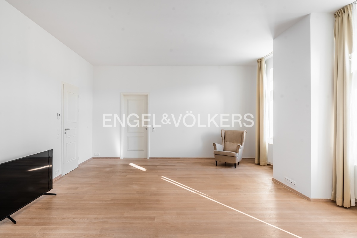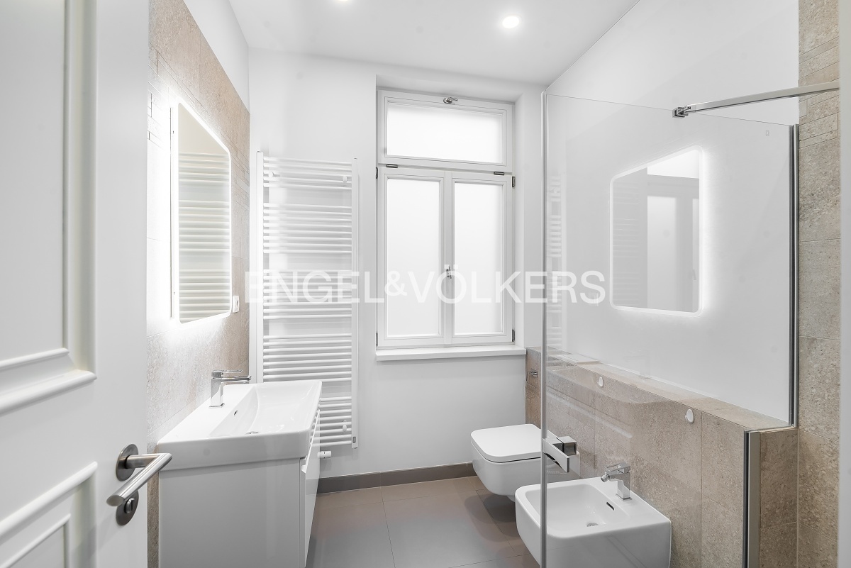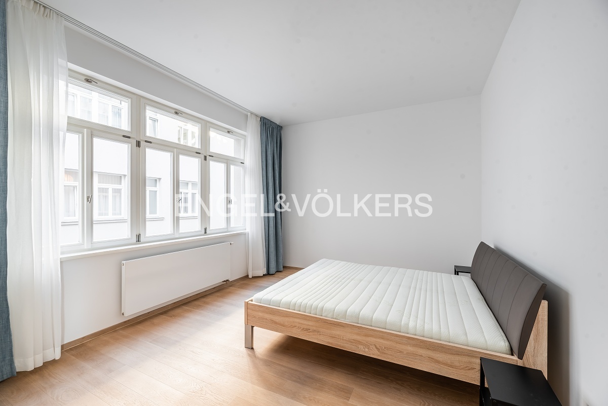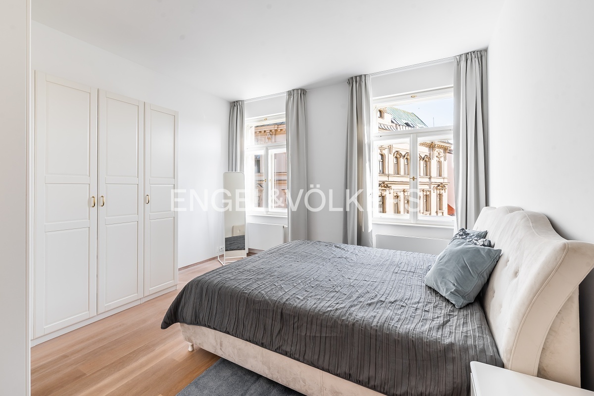 Praktické rozložení tohoto bytu nabízí vstupní místnost, ložnici orientovanou do klidného vnitrobloku, koupelnu se sprchou, toaletou a bidetem, prostorný obývací pokoj s kompletně vybavenou kuchyní včetně myčky a vestavěné lednice. Druhá ložnice je s okny do ulice Jungmannova a s en suite koupelnou včetně toalety a vany.