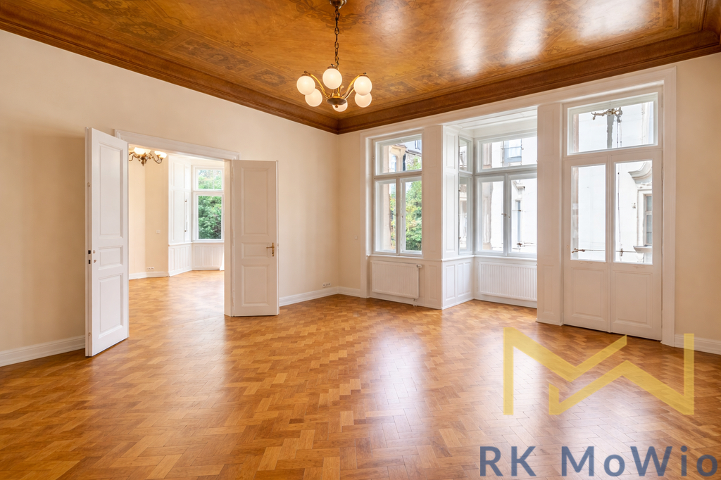 Na pronájem nabízíme nezařízený byt o dispozici 4+1 o podlahové ploše 151 m² se dvěma balkóny, situovaný ve 2. patře (3. nadzemní podlaží) bytového domu s výtahem a recepcí, v ulici Pařížská na Praze 1 – Staré Město.
