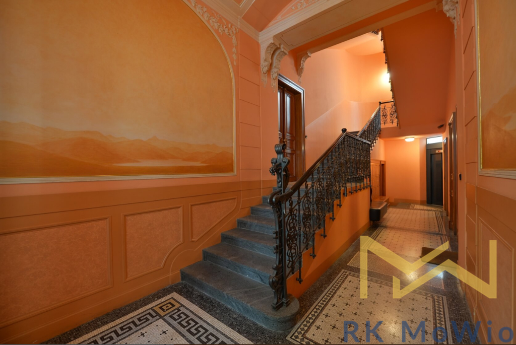 Půdorys bytové jednotky disponuje vstupní halou, prostorným obývacím pokojem s arkýřem a vstupem na balkón, samostatnou kuchyní, jídelnou se vstupem na druhý balkón a do komory, třemi ložnicemi, koupelnou (vana, umyvadlo, toaleta, bidet) a samostatnou toaletou. Vybavení bytu: kuchyňská linka (včetně sklokeramické varné desky, elektrické trouby, lednice s mrazákem a myčky), pračka, sušička, historické architektonické prvky včetně stropní malby, vysoké stropy a kvalitní materiály odpovídající prestižní adrese.