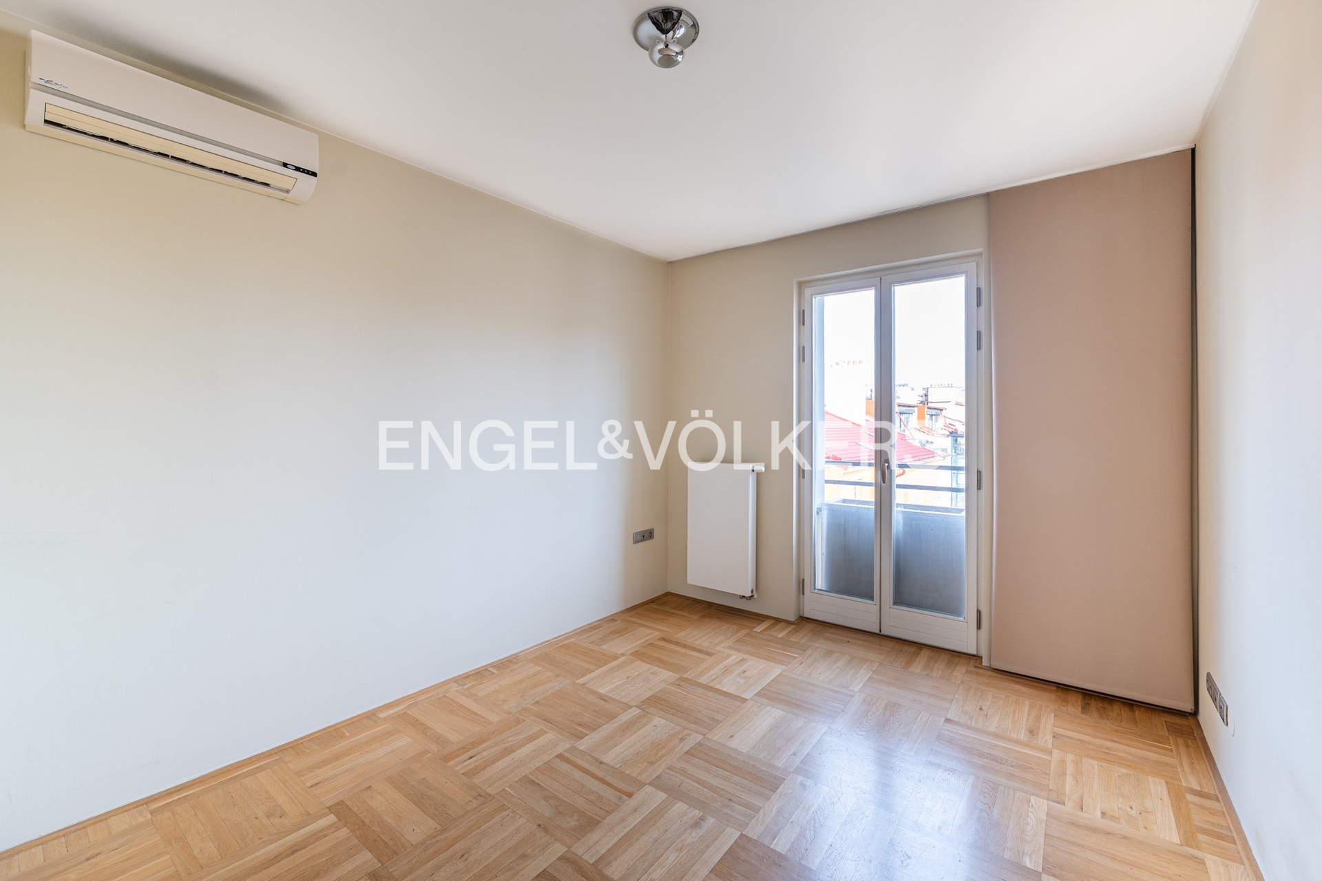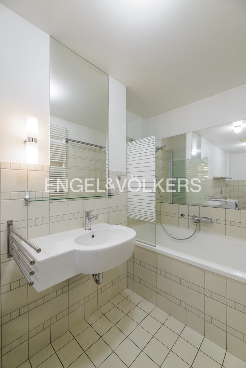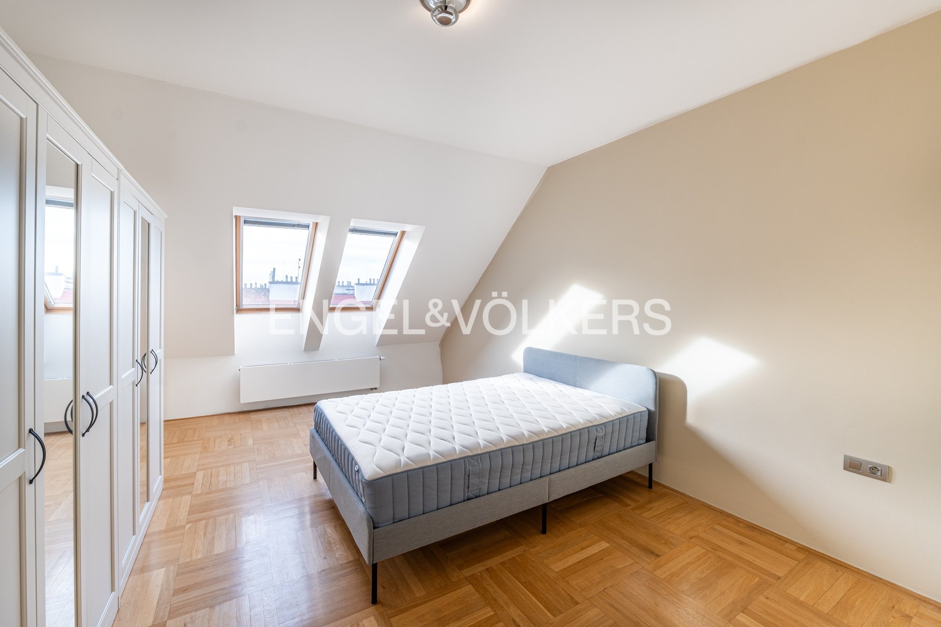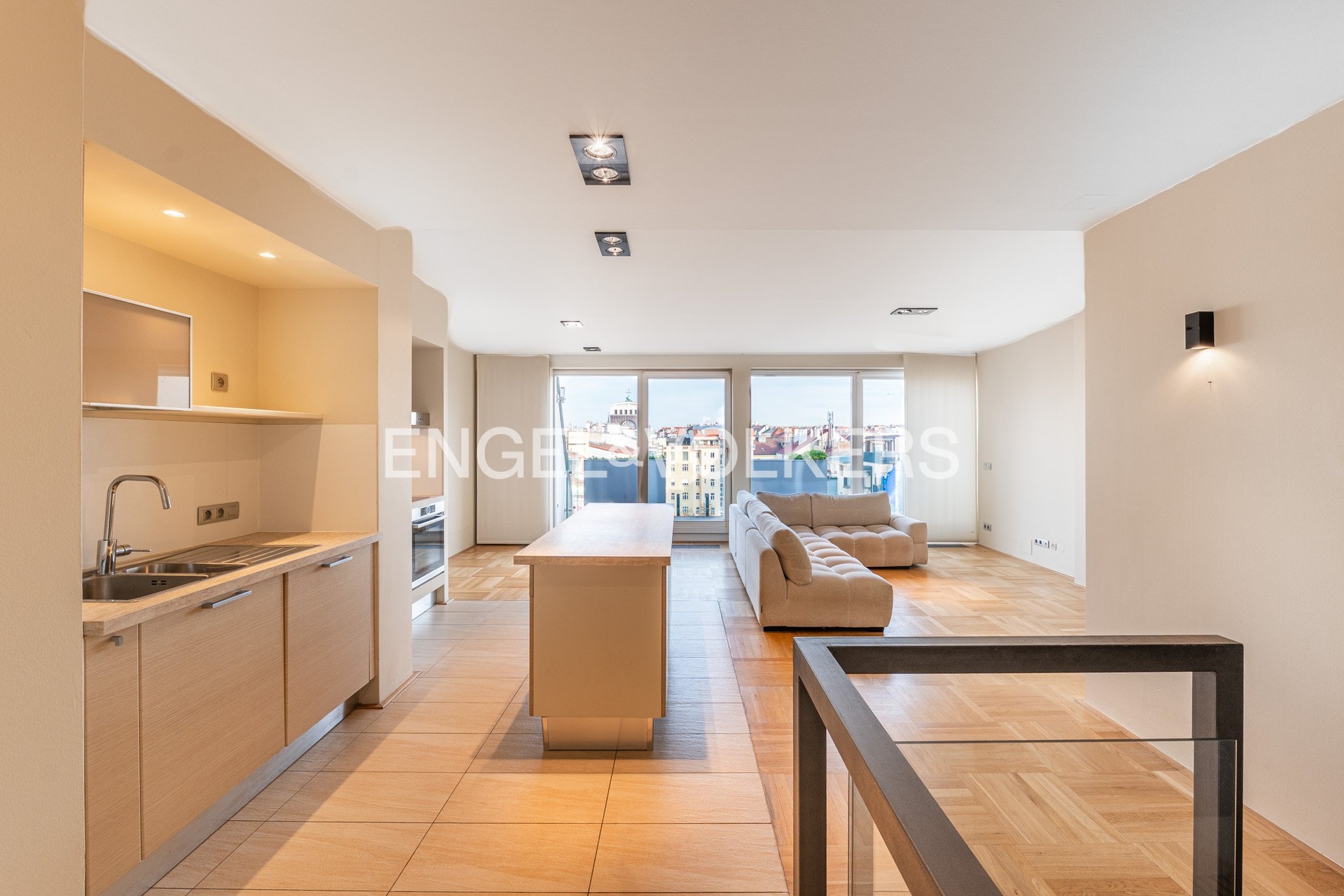 Ve spodní úrovni bytu se nachází tři ložnice a prostorná koupelna s toaletou. Dvě ložnice s francouzskými okny a balkonem jsou orientovány do pěkného vnitrobloku s výhledem na kostel na náměstí Jiřího z Poděbrad, zatímco třetí ložnice s dřevěnými střešními okny směřuje do ulice U Kanálky. Ve vyšším podlaží je umístěn světlý obývací pokoj s kuchyňskou linkou a ostrůvkem, samostatná toaleta a komora s nečekaně krásným výhledem na Prahu.