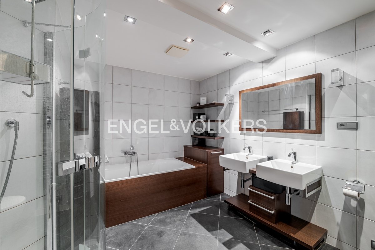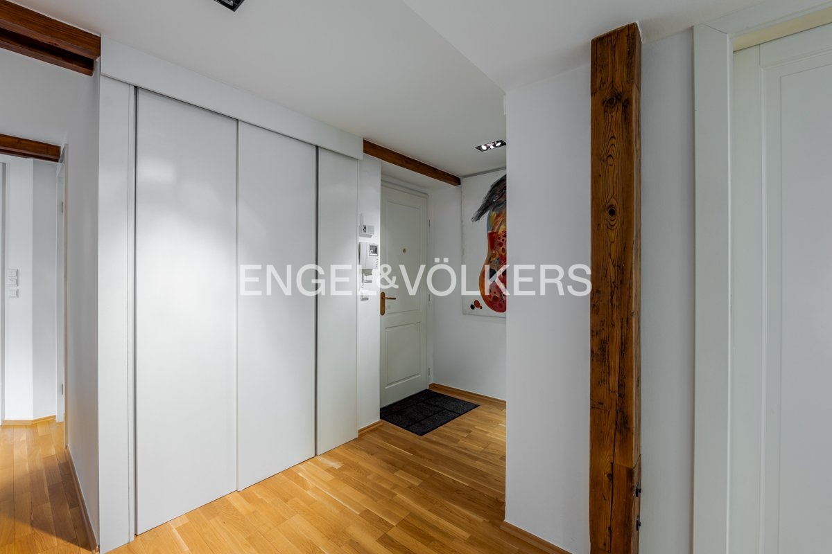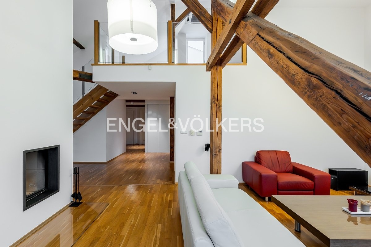 Podlahovou plochu zrekonstruovaného bytu o výměře 210 m² tvoří dispozice 5+kk s galerií s osvětlením značkovými svítidly iGuzzini s inteligentním ovládáním. Dominantou dispozice je spodní úroveň bytu, kde se rozkládá obývací pokoj se zimní zahradou a jídelnou s kuchyní o velikosti 58 m². Obytný prostor zpříjemňuje dřevěná podlaha, přírodní krb, přiznané trámy a nové ateliérové okno, které vnáší do interiéru mnoho přirozeného světla. V obytném prostoru je zabudováno ozvučení značky Bose. Součástí vybavení obývacího pokoje je audio a video technika Pioneer a 3D televize Panasonic. Nadčasová kuchyňská linka je vybavena spotřebiči Miele, včetně digestoře s odtahem, a pracovní deskou z žuly. V této úrovni bytu se dále nachází hlavní ložnice, velkorysá šatna s potenciálem další ložnice a pokoj. Samozřejmostí je také pohodlně velká koupelna, která disponuje vanou, sprchovým koutem i toaletou a bidetem značky Villeroy & Boch. Nachází se zde i samostatné WC vybavené taktéž sanitou značky Villeroy & Boch, komora se safem a úložné prostory včetně vestavěného nábytku na míru. Všechna okna jsou vybavena plisé žaluziemi, v hlavní ložnici zatmívacími.