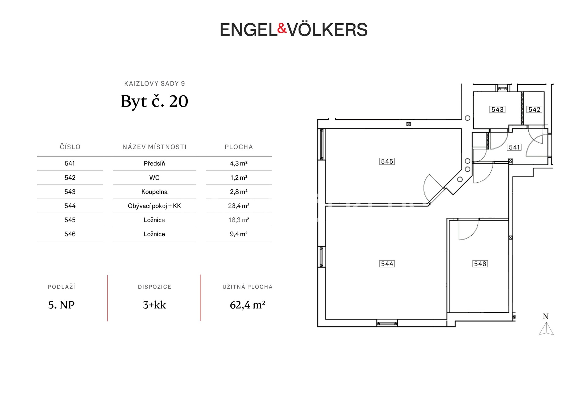V 5. nadzemním podlaží udržovaného domu se nachází tento rohový byt s dispozicí 3+kk a celkovou plochou 62,3 m². Díky orientaci na východ do Kaizlových sadů a na jih do klidné, slepé ulice Petra Slezáka je byt mimořádně světlý a zároveň tichý – ideální kombinace pro pohodlné městské bydlení.