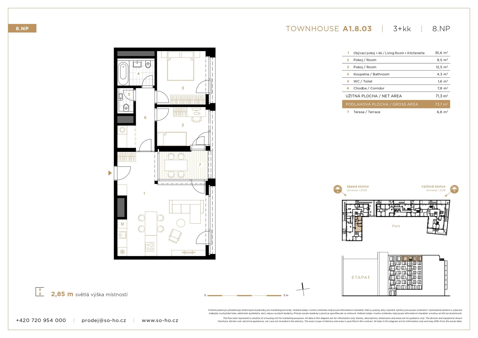 Nabízíme k prodeji unikátní střešní townhouse v projektu SO-HO Rezidence, který představuje originální spojení svobody rodinného domu a komfortu moderního bytu. Tento byt s klimatizací o dispozici 3+kk a podlahové ploše 73,7 m² se nachází v 8. nadzemním podlaží a patří k limitované edici pouze třinácti jedinečných střešních domů.