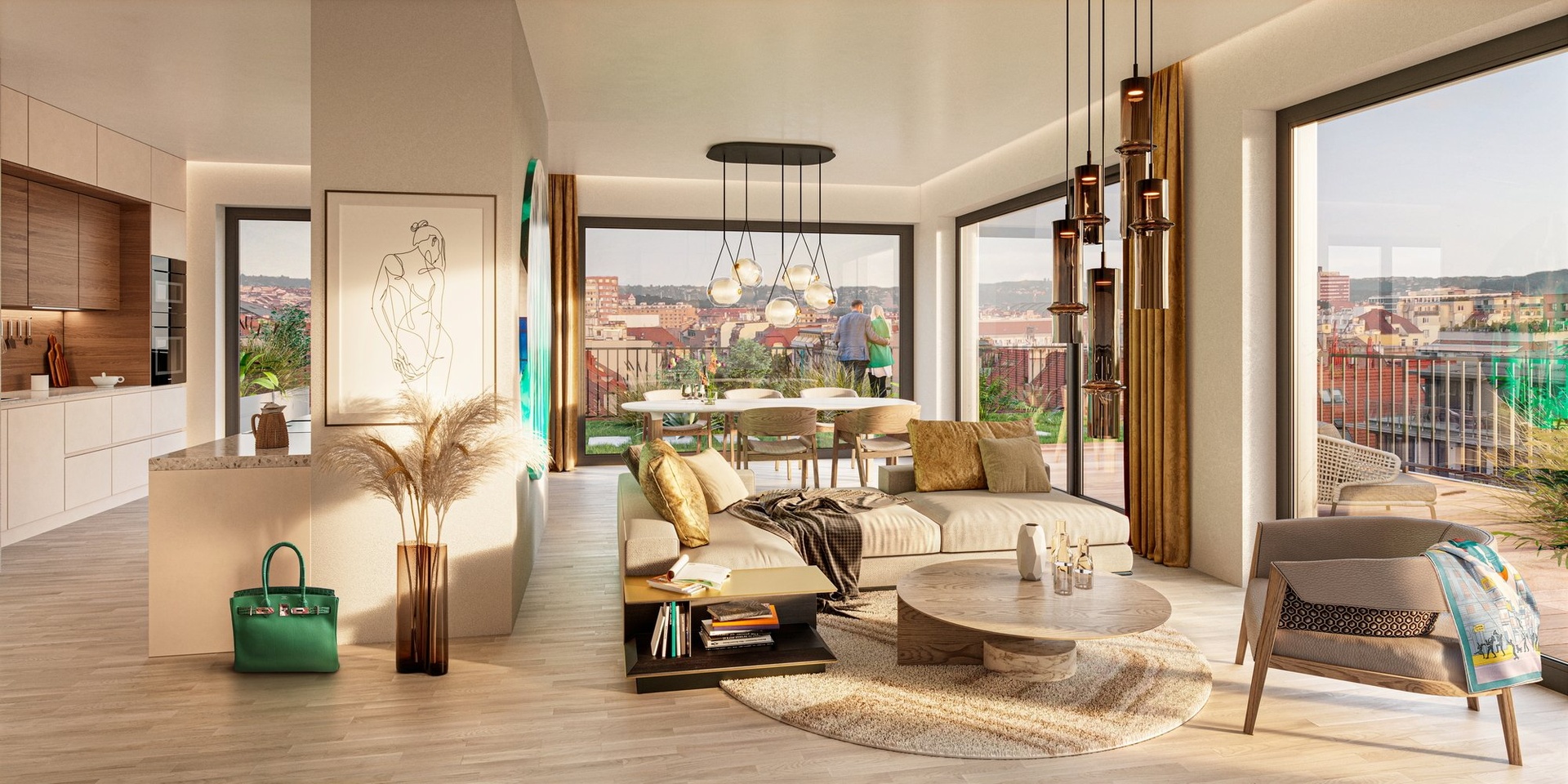 Součástí jednotky je soukromá terasa (6,8 m²) vysoko nad střechami Holešovic, kde si můžete vytvořit zelený ostrov klidu s výhledy na město. Terasa poskytuje prostor pro relaxaci, rodinné chvíle i setkávání s přáteli. Ráno zde načerpáte energii prvních paprsků slunce, večer se rozloučíte s oblohou měnící barvy, a v zimě si vychutnáte zasněženou atmosféru vysoko nad městem.