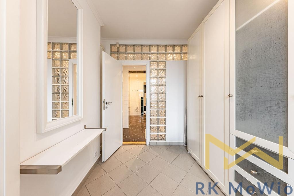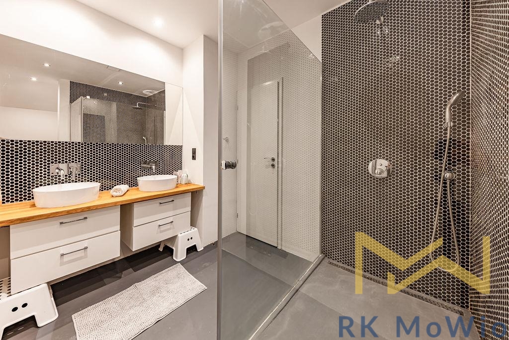 Půdorys bytové jednotky disponuje vstupní halou, světlým obývacím pokojem, samostatnou kuchyní, 4 ložnicemi do vnitrobloku, 3 koupelnami (s vanou, sprchou, umyvadlem, bidetem a toaletou), šatnou, galerií a střešní terasou. Vybavení bytu: moderní kuchyňská linka (se zabudovanými spotřebiči včetně lednice s mrazákem, sklokeramické varné desky, digestoře, myčky a elektrické trouby), vestavěné skříně, připojení pračky a sušičky, příprava pro vysokorychlostní internet, dřevěné podlahy a dlažba. K dispozici je také garážové stání.