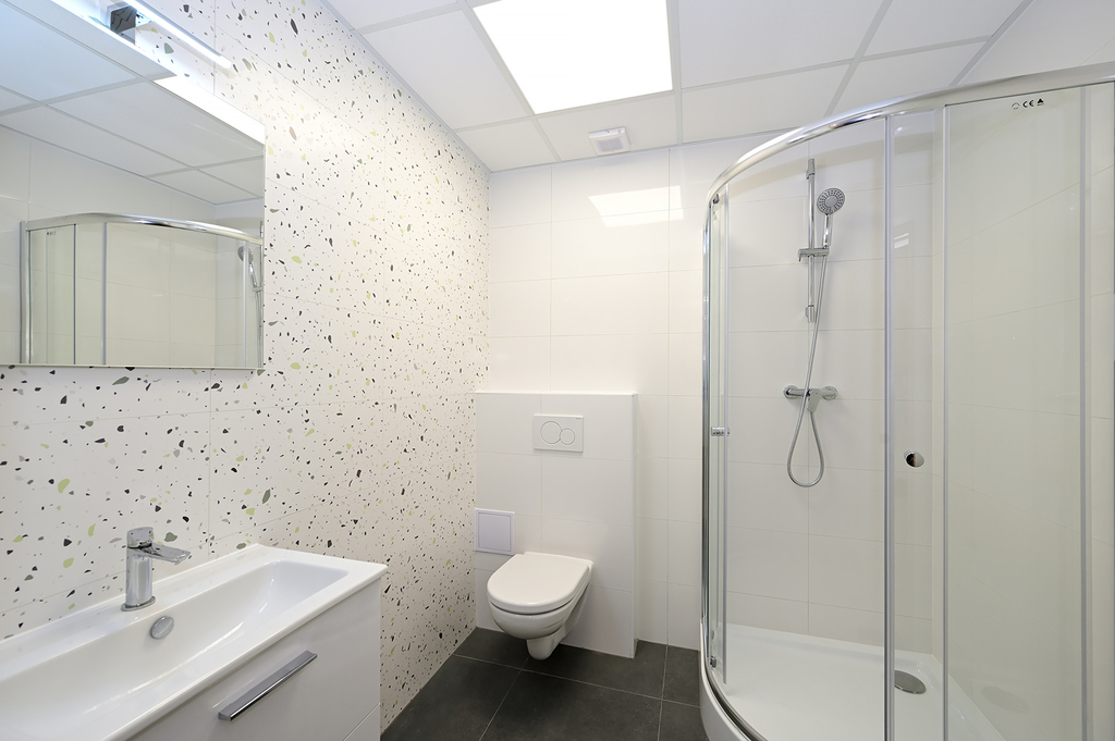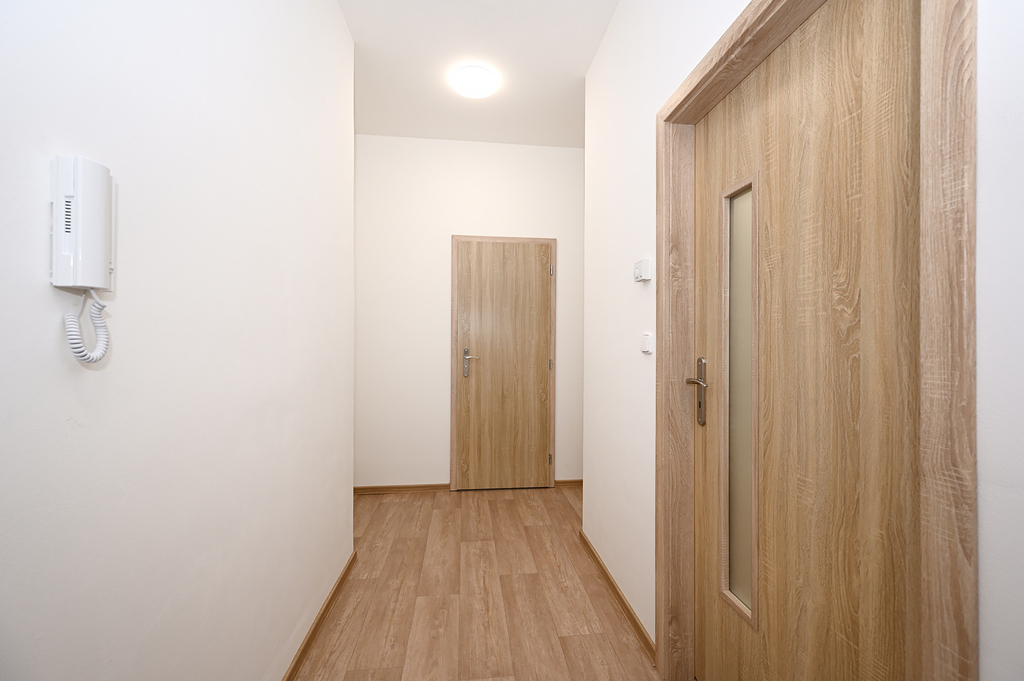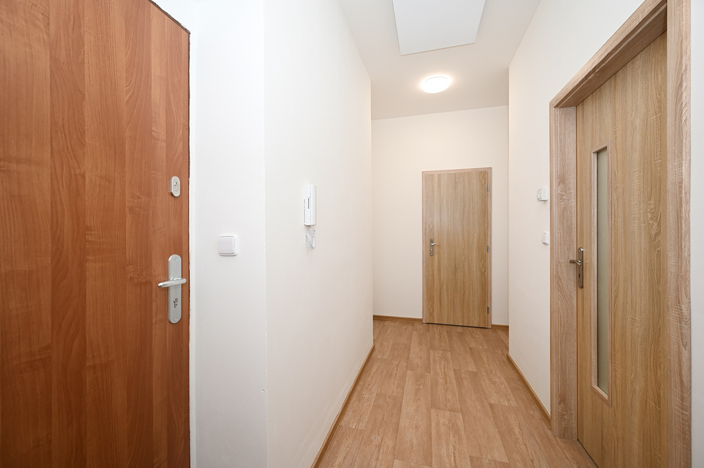 Dispozice bytu zahrnuje předsíň (6 m²), hlavní obytnou místnost s kuchyňským koutem (22 m²) a koupelnu se sprchovým koutem a toaletou (4 m², bez pračky). Kuchyňská linka je vybavena vestavěnou lednicí s mrazákem, el. troubou, varnou deskou, myčkou a digestoří. Ohřev vody zajišťuje el. bojler, vytápění pak moderními stropními infrapanely, které poskytují příjemné a rovnoměrné teplo.