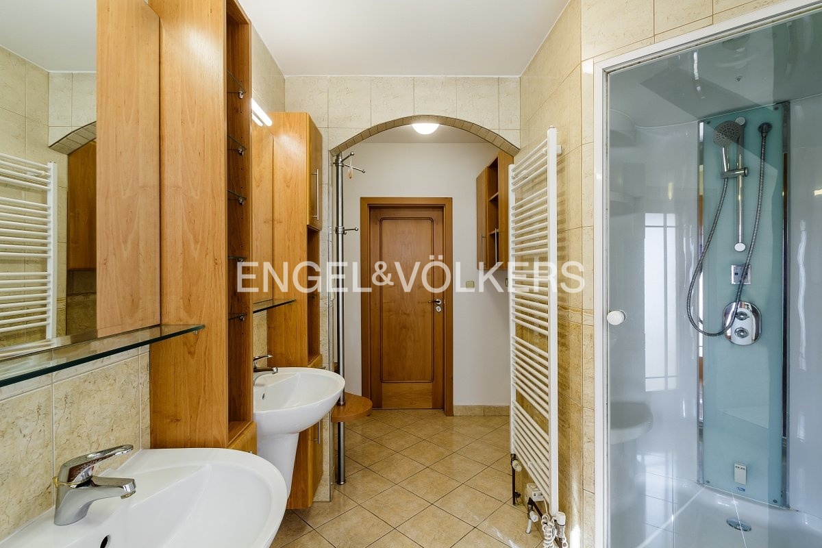 Byt disponuje terasou 14 m² orientovanou na východ a balkonem 6 m², které poskytují příjemný prostor pro relaxaci a posezení s výhledem na město. Interiér zahrnuje velké ložnice, obrovskou jídelnu, dvě koupelny a krb, který dodává prostoru útulnou atmosféru.