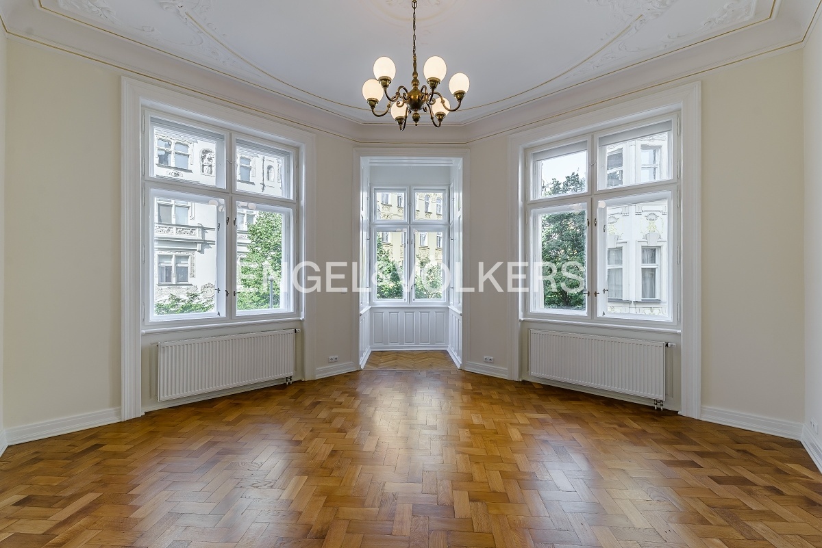 Prostorný byt na velmi prestižní adrese se nachází ve 3. nadzemním podlaží historického secesního domu s 24 hodinovou recepcí a výtahem. Byt je po kompletní rekonstrukci, při které se dbalo na zachování původních prvků jako jsou dřevěné parkety, štuky a dřevěný strop v obývacím pokoji. Byt nabízí celkem tři ložnice, prostorný obývací pokoj, jídelnu s plně vybavenou kuchyní se všemi spotřebiči, koupelnu a oddělenou toaletu. K dispozici je připojení k optickému internetu PE3ny net, 24h ostraha v ceně nájmu.