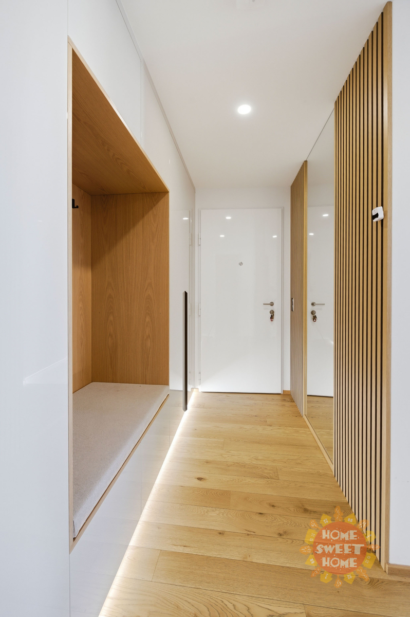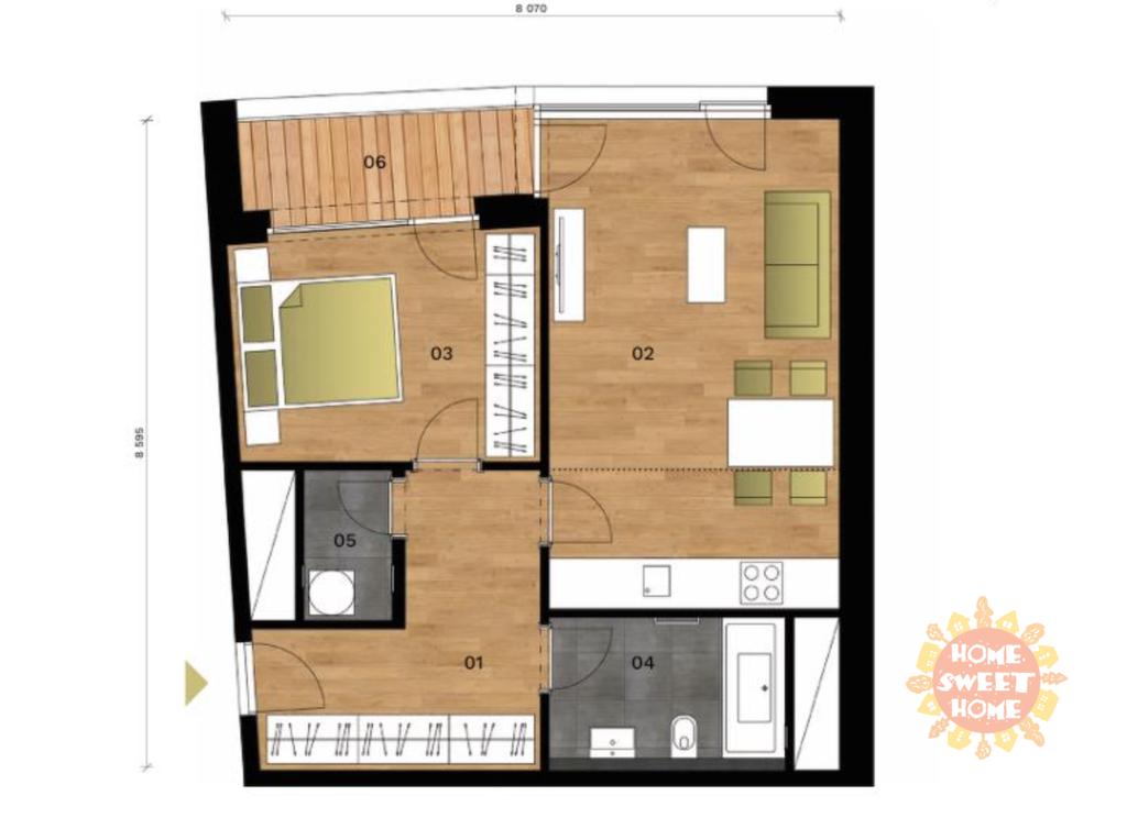 Prakticky řešený byt sestává z předsíně s vestavěnými skříněmi na míru, obývacího pokoje moderním s kuchyňským koutem a vstupem na terasu, která je přístupná také z ložnice. Zázemí bytu doplňuje moderní koupena s vanou a WC a komora s pračkou a sušičkou.