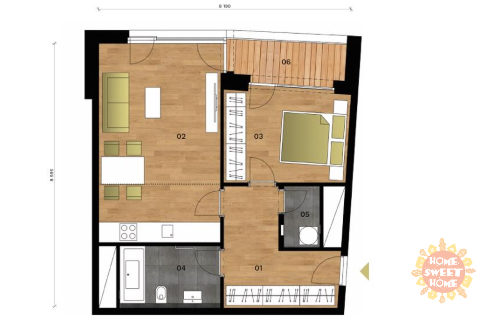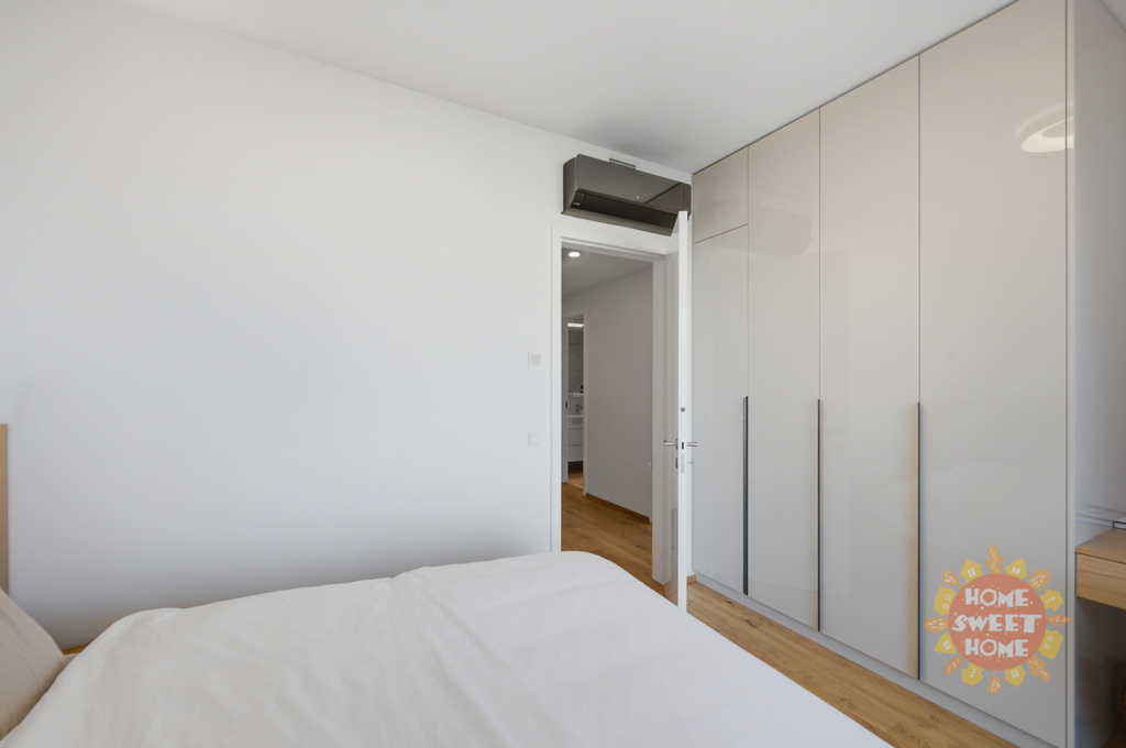 Prakticky řešený byt sestává z předsíně s vestavěnými skříněmi na míru, obývacího pokoje s kuchyňským koutem a vstupem na terasu, která je přístupná také z ložnice. Zázemí bytu doplňuje moderní koupena s vanou a WC a komora s pračkou a sušičkou.
