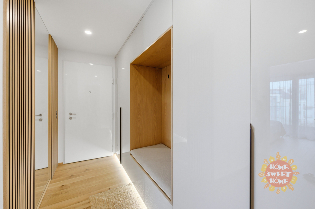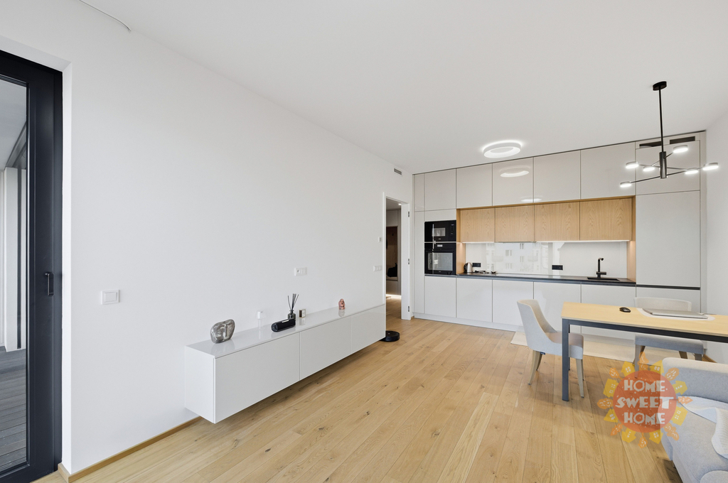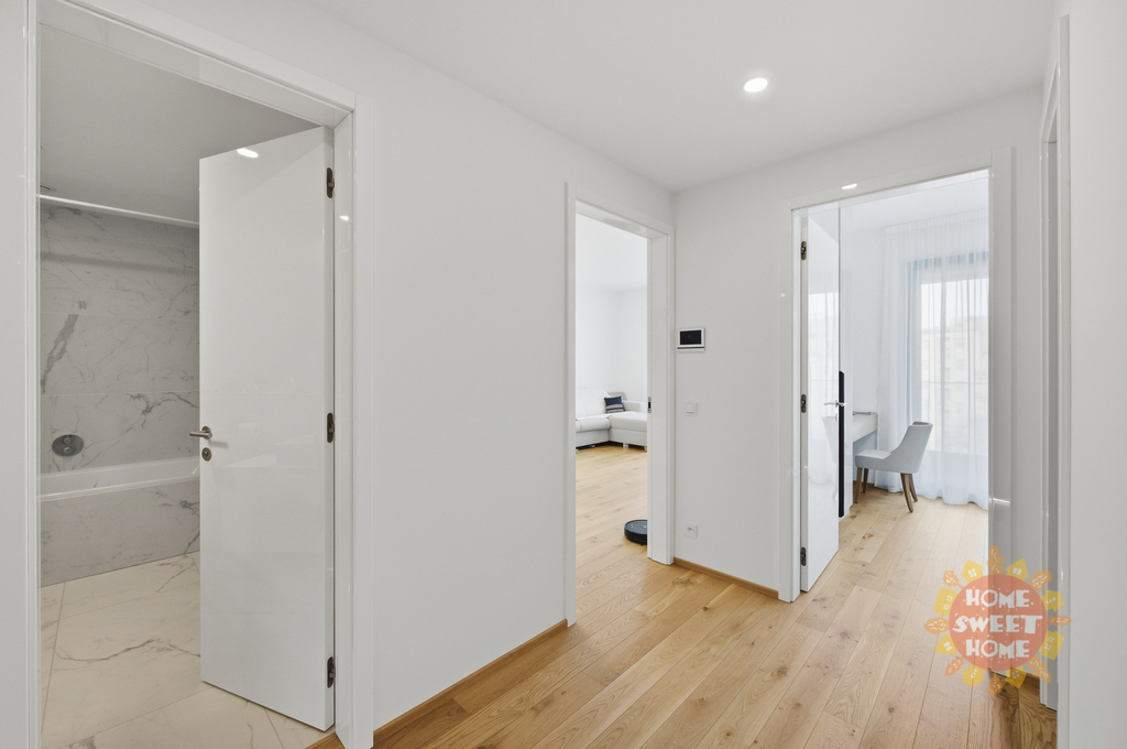 Prakticky řešený byt sestává z předsíně s vestavěnými skříněmi na míru, obývacího pokoje s kuchyňským koutem a vstupem na terasu, která je přístupná také z ložnice. Zázemí bytu doplňuje moderní koupena s vanou a WC a komora s pračkou a sušičkou.