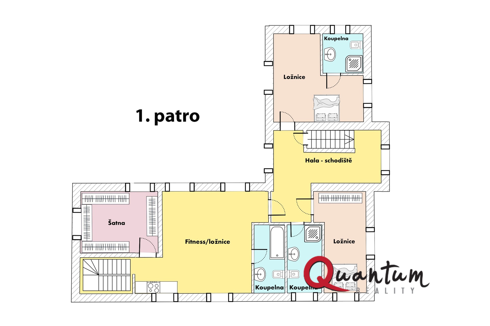 Ložnice s vlastní koupelnou, ložnice, 2x koupelna, šatna, velká podkrovní místnost s kuchyňským koutem aktuálně využívaná jako fitness (snadná možnost změny na další ložnici se šatnou a koupelnou, případně nezávislého 2KK se šatnou a koupelnou k bydlení pro hosty či rodiče apod.)