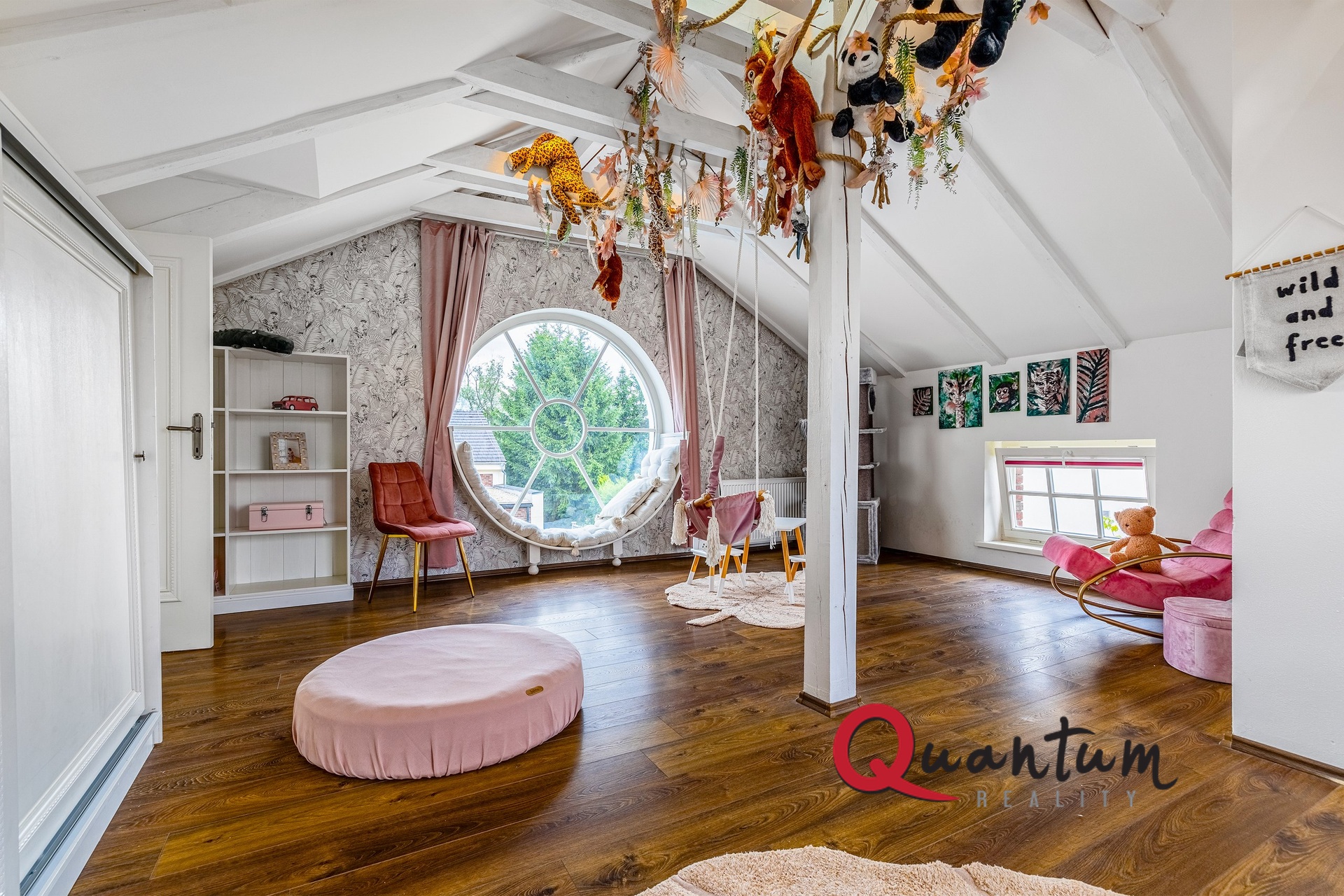 Ložnice s vlastní koupelnou, ložnice, 2x koupelna, šatna, velká podkrovní místnost s kuchyňským koutem aktuálně využívaná jako fitness (snadná možnost změny na další ložnici se šatnou a koupelnou, případně nezávislého 2KK se šatnou a koupelnou k bydlení pro hosty či rodiče apod.)