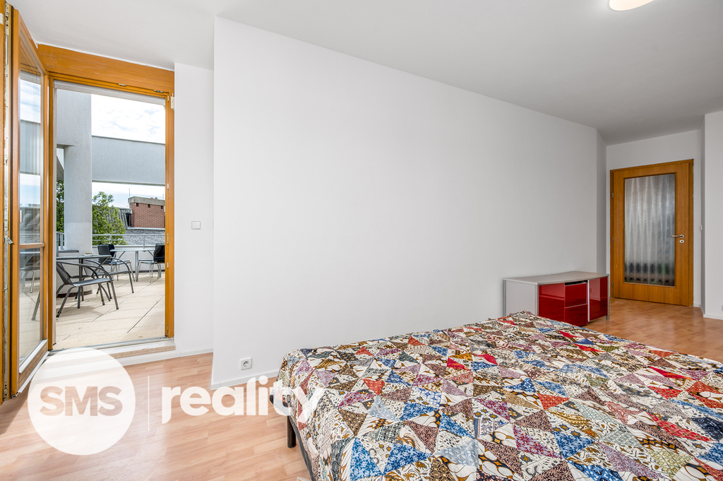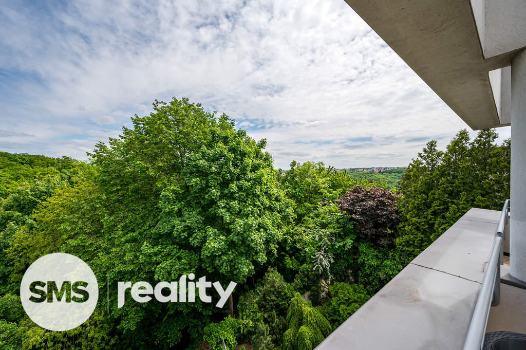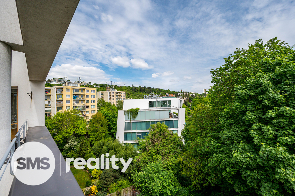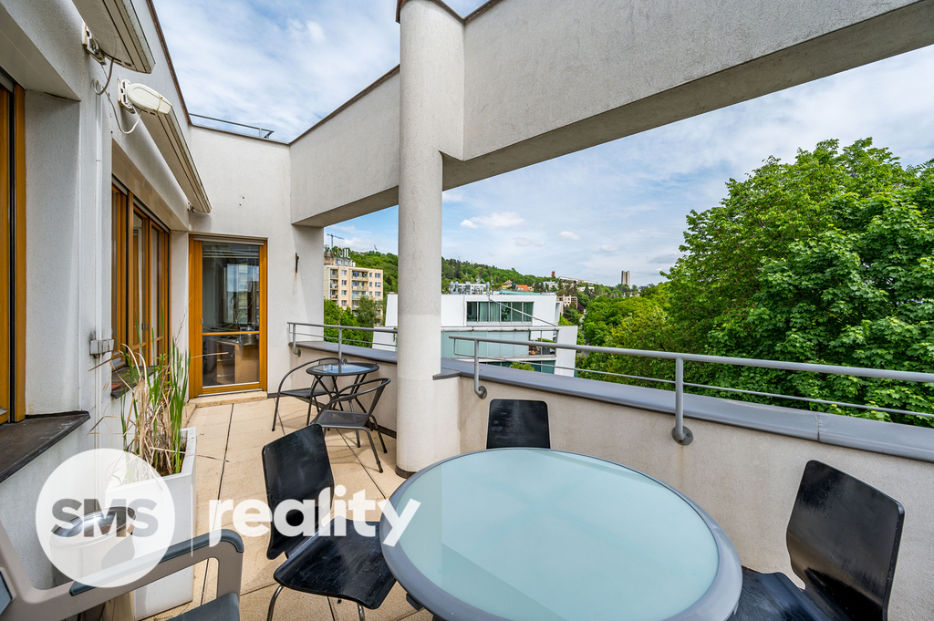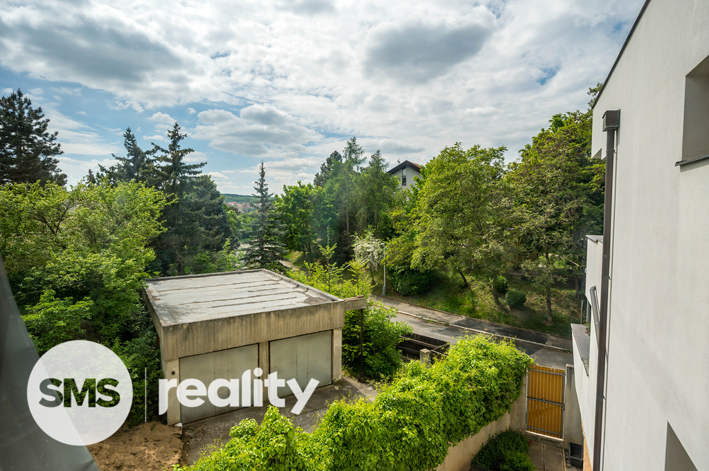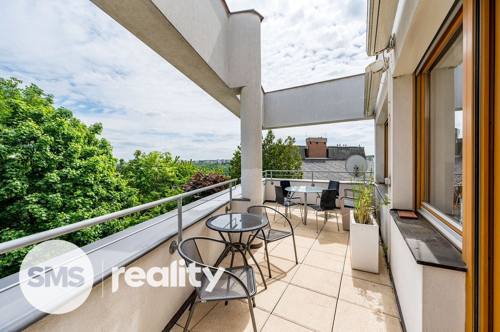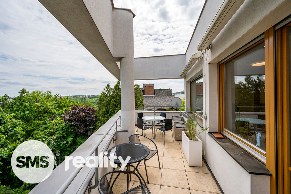 Světlý byt s velkou terasou, výhledem do korun stromů a garáží – jen pár minut od Pražského hradu