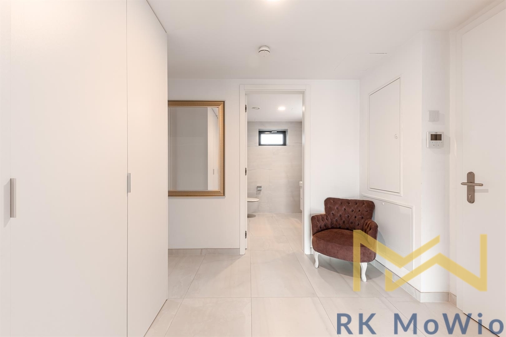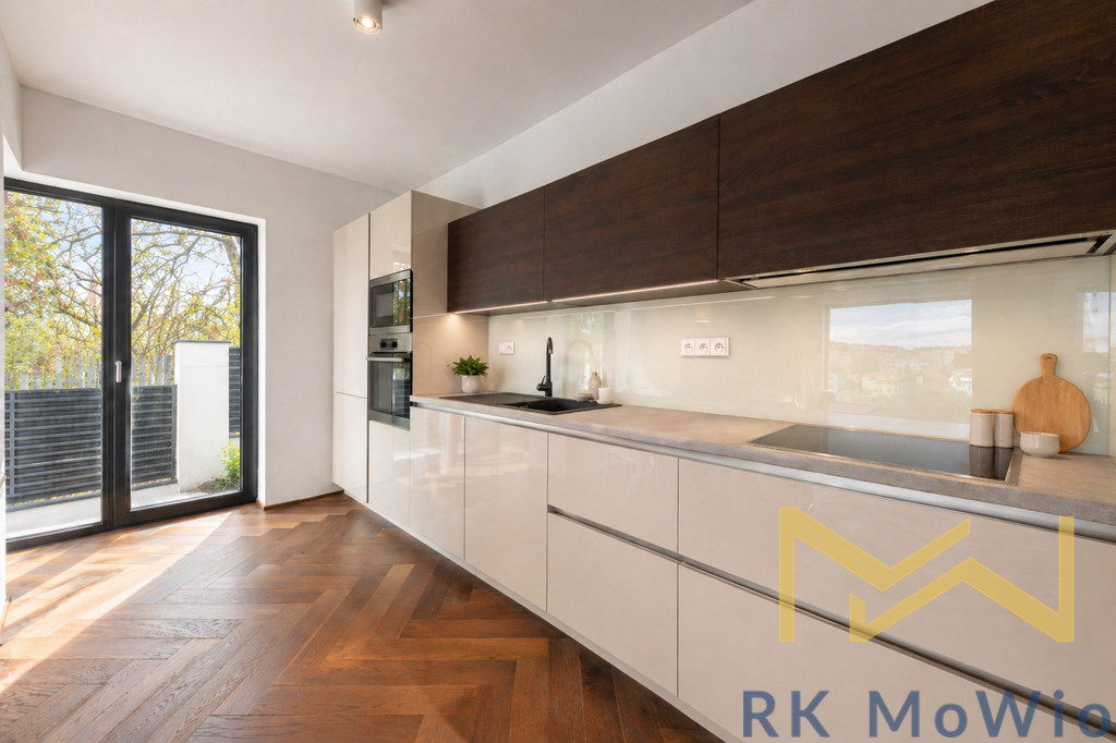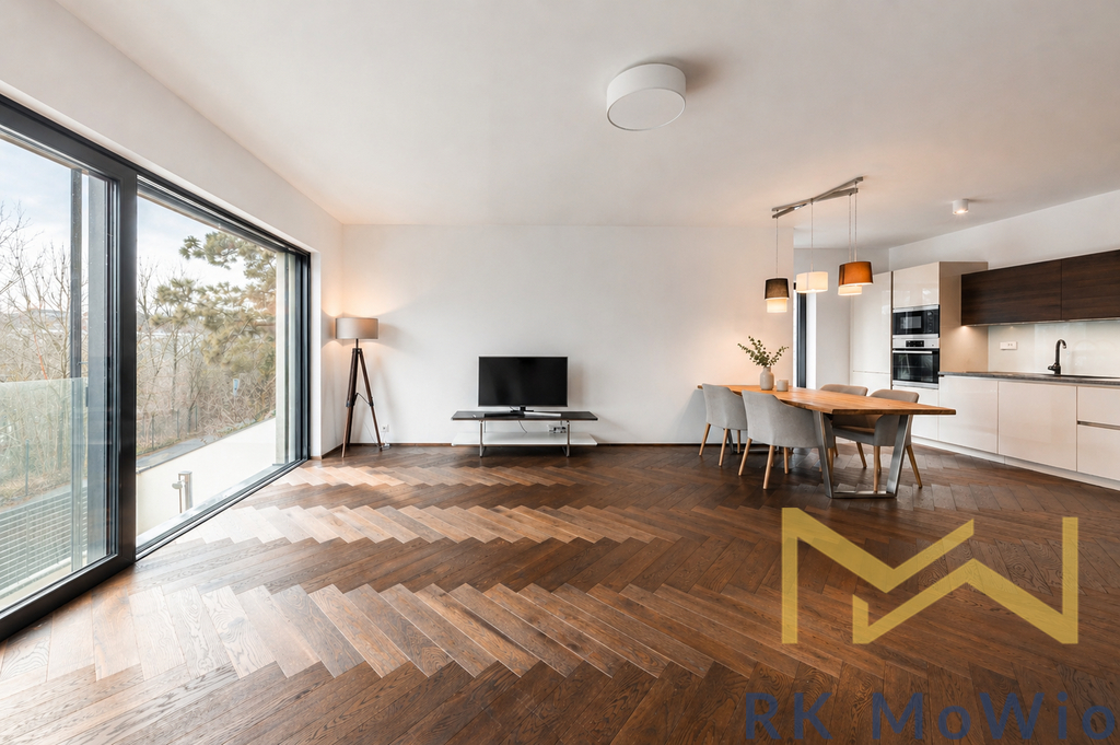 Dispozice bytové jednotky je prakticky a zároveň velmi vzdušně řešena. Vstupní chodba plynule navazuje na hlavní obytný prostor, který tvoří prostorný obývací pokoj s velkoformátovými okny zajišťujícími dostatek denního světla po celý den. Na obývací část navazuje plně vybavený kuchyňský kout s jídelním prostorem. Dále byt nabízí samostatnou ložnici a koupelnu (sprchový kout, umyvadlo, toaleta). Celkové uspořádání působí velmi moderně a funkčně, s důrazem na komfort každodenního bydlení. Byt je disponuje chytrou domácností a nadstandardním technologickým vybavením. K dispozici je kuchyňská linka včetně lednice s mrazákem, sklokeramické varné desky, elektrické a mikrovlnné trouby a myčky. Součástí jsou vestavěné skříně, přípojka pro pračku, rekuperace vzduchu, klimatizace, dálkový přístup s inteligentním ovládáním a videotelefon. Samozřejmostí jsou kvalitní dřevěné podlahy v kombinaci s dlažbou. Celkový standard bytu odpovídá moderním nárokům na kvalitní a komfortní bydlení. K bytu náleží garážové parkovací stání a sklep přímo v domě, které je již zahrnuto v kupní ceně.