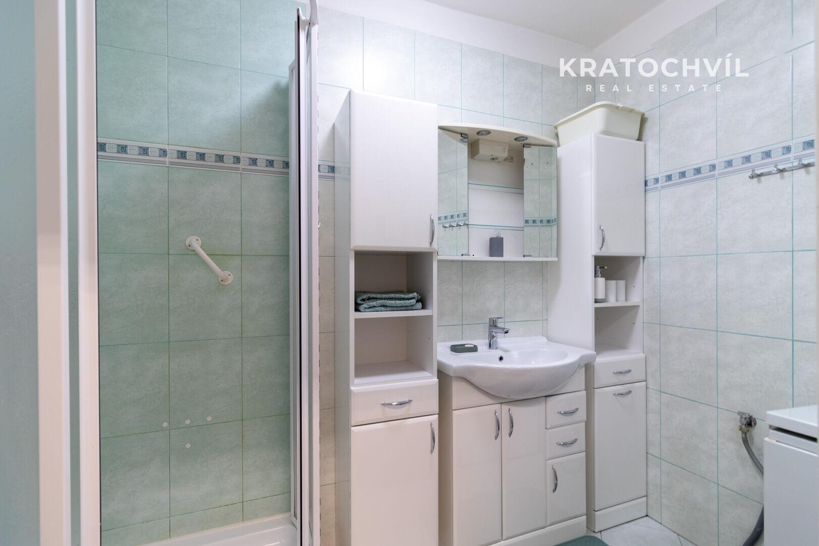 Koupelna disponuje sprchovým koutem, umyvadlem s galerií a pračkou.