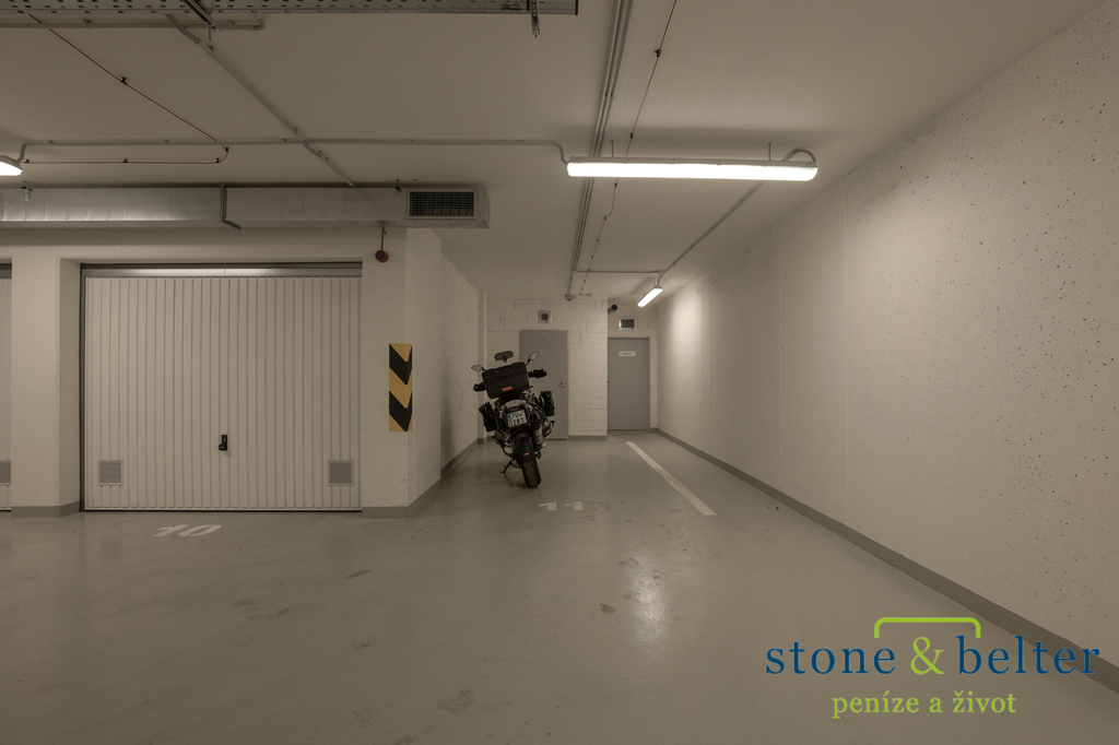 Dispozice bytu zahrnuje prostornou vstupní chodbu, koupelnu se sprchovým koutem a toaletou, samostatnou ložnici a obývací pokoj s kuchyňským koutem a vstupem na lodžii. K bytu náleží také prostorný sklep, umístěný přímo u parkovacího stání. Parkovací stání je možné pronajmout za 1 600 Kč/měsíc.
