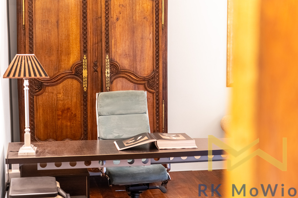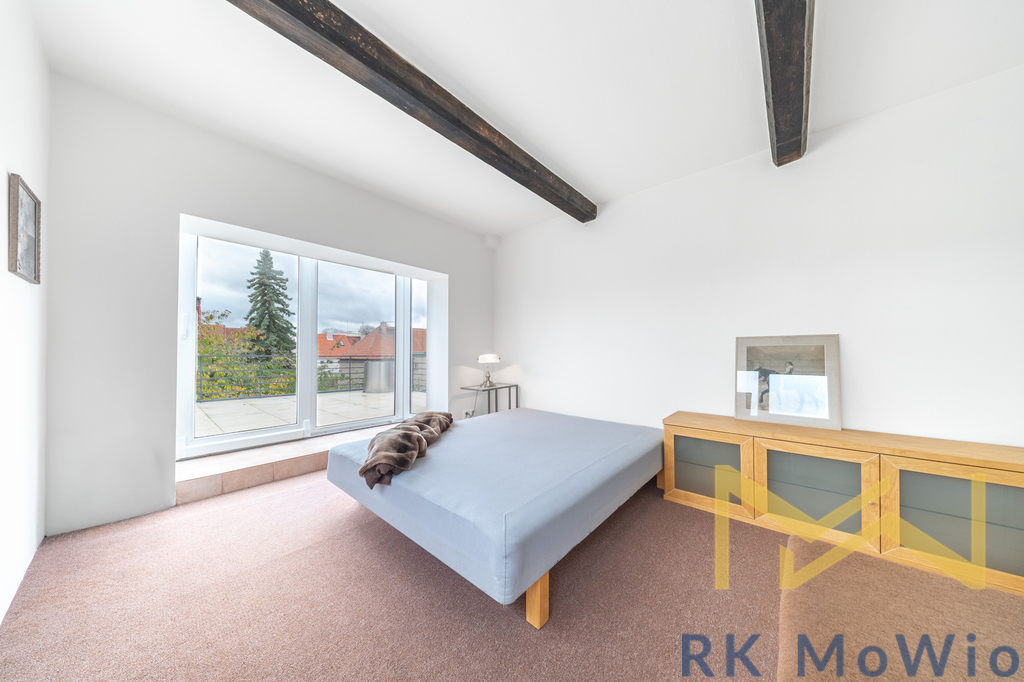 V podkroví je útulný pokoj s terasou a výhledem na Pražský hrad – ideální jako relaxační kout, čítárna nebo ateliér.
