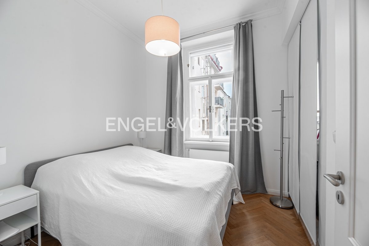 V bytě jsou dřevěné parkety a vestavěný úložný prostor v ložnici.