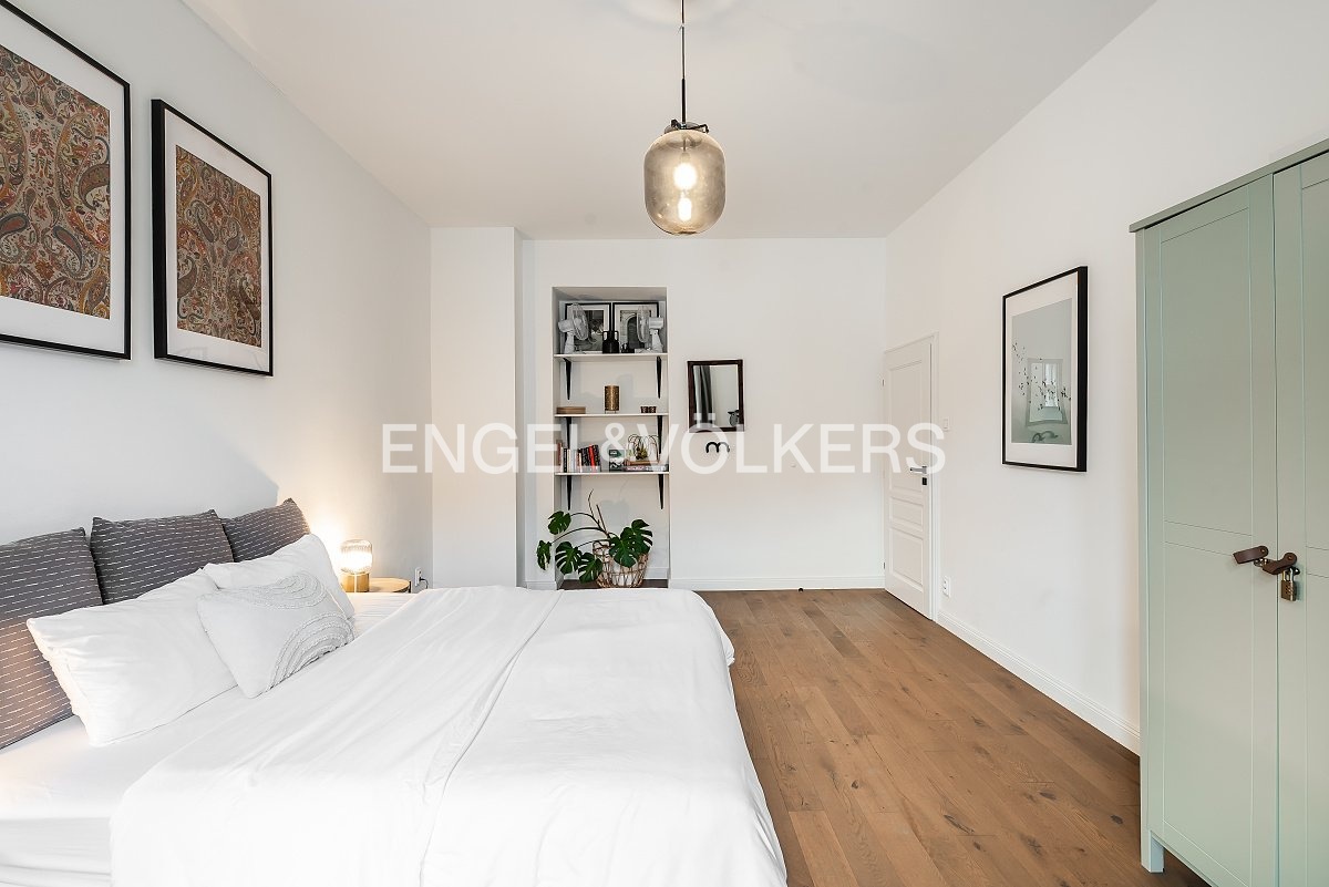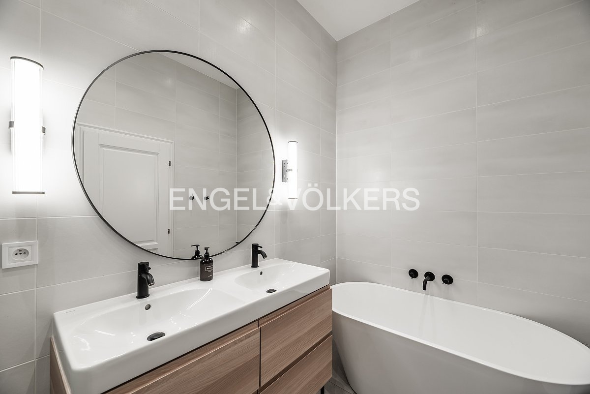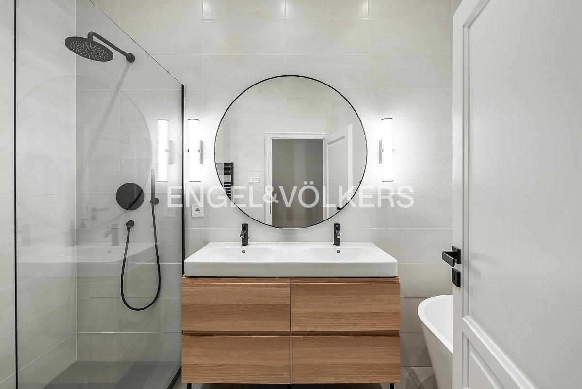 Byt byl kompletně zrekonstruován v roce 2023 a disponuje vysokými stropy. Dispozice zahrnuje vzdušnou vstupní halu, která je přímo propojená s obytným prostorem a kuchyní, tři neprůchozí ložnice, koupelnu s vanou i sprchovým koutem a oddělenou toaletu s umyvadlem. Byt je orientován do ulice a vnitrobloku; obývací prostor s kuchyňskou linkou s ostrůvkem směřuje do vnitrobloku s výhledem na stromy, zatímco ložnice s novými izolačními okny jsou orientované na západ do ulice Letenská. V bytě jsou osazena izolační a repasovaná špaletová okna, vstupní dveře jsou tradiční dvoukřídlé. Vytápění je řešeno centrálně.