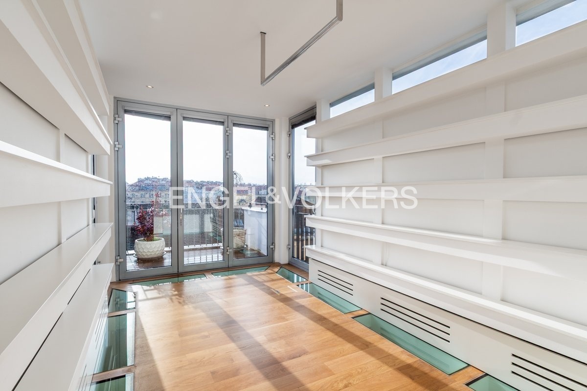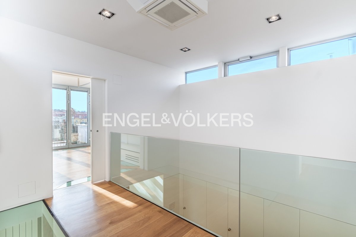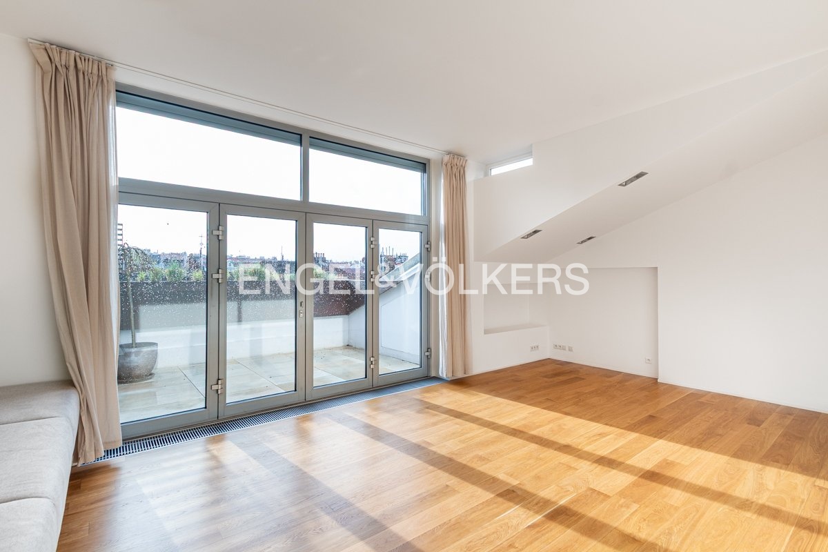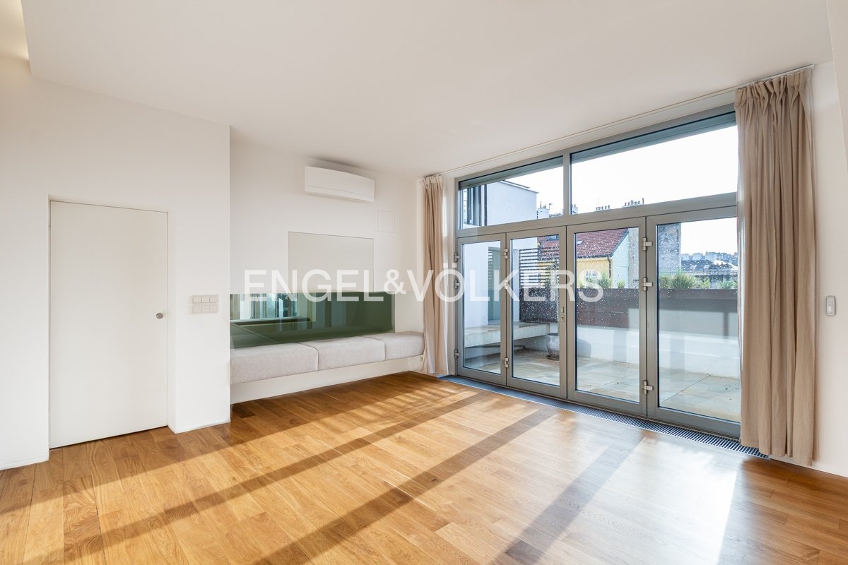 K pronájmu je k dispozici elegantní kompletně zrekonstruovaný penthouse s přímým vstupem z výtahu, umístěný v nejvyšším 6. nadzemním podlaží pečlivě renovovaného činžovního domu. Byt se vyznačuje třemi prostornými terasami, které jsou všechny orientované na jih a poskytují dostatek světla.