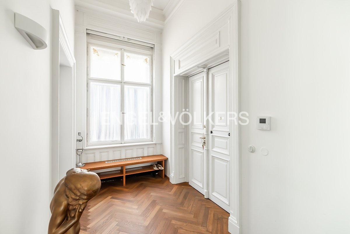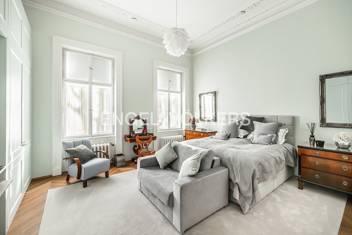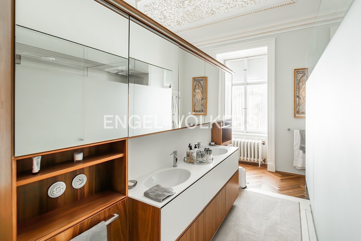Interiér si zachoval původní historické prvky – zdobené a zlacené stropy, kachlová kamna a dvoukřídlé dveře. Byt dále nabízí parketové podlahy, stylová topná tělesa a keramické vypínače v historickém designu, vestavěné šatní skříně, repasovaná okna a vnitřní okenice. Vytápění zajišťuje vlastní plynový kotel.