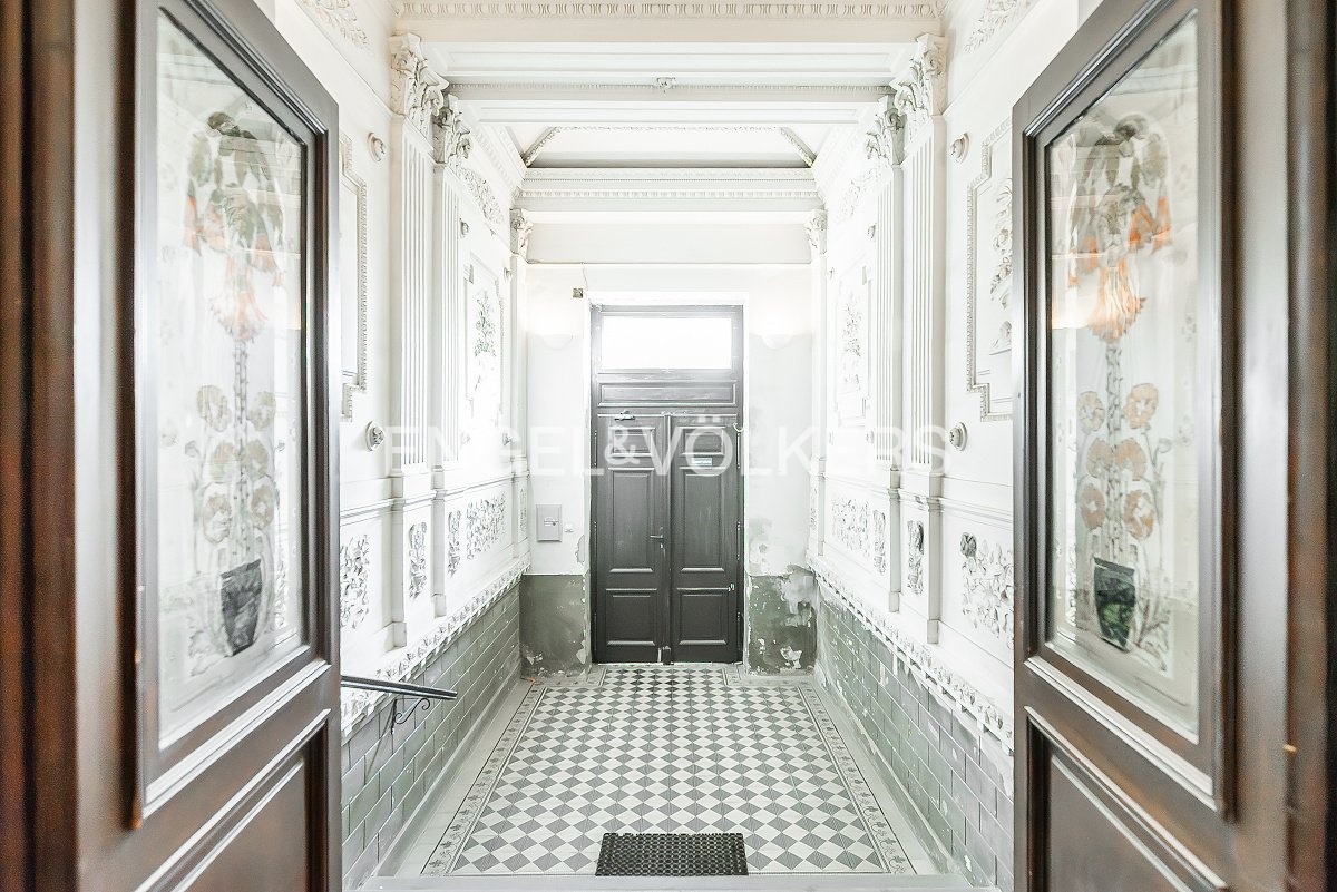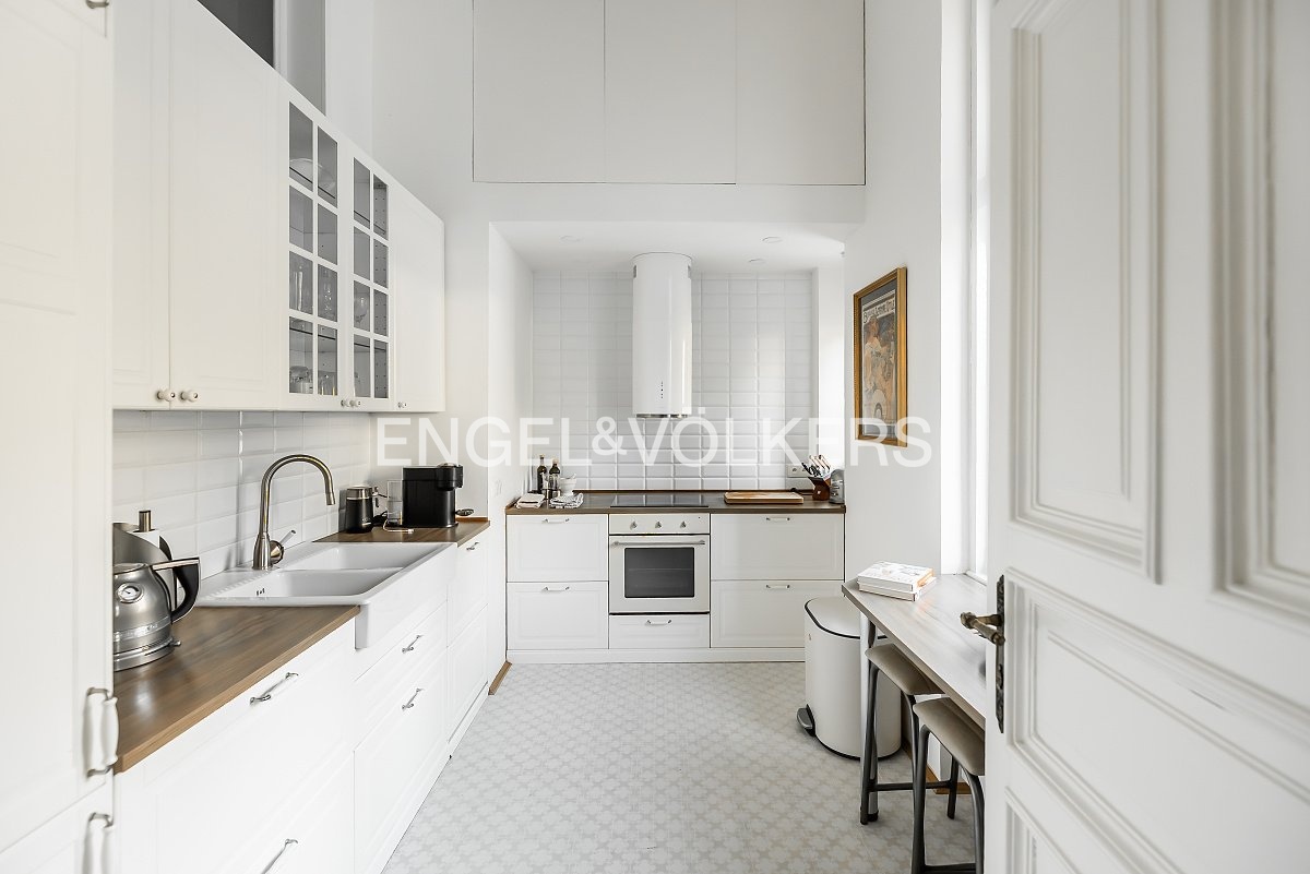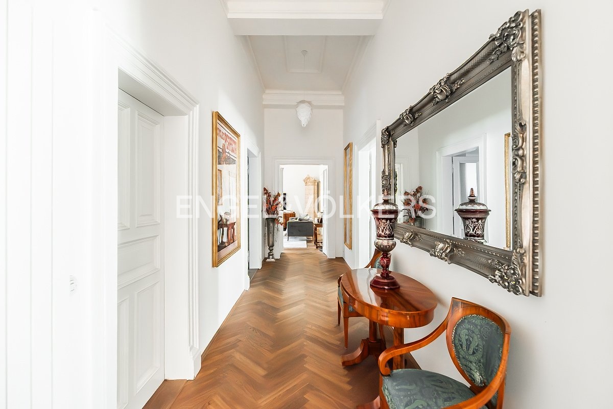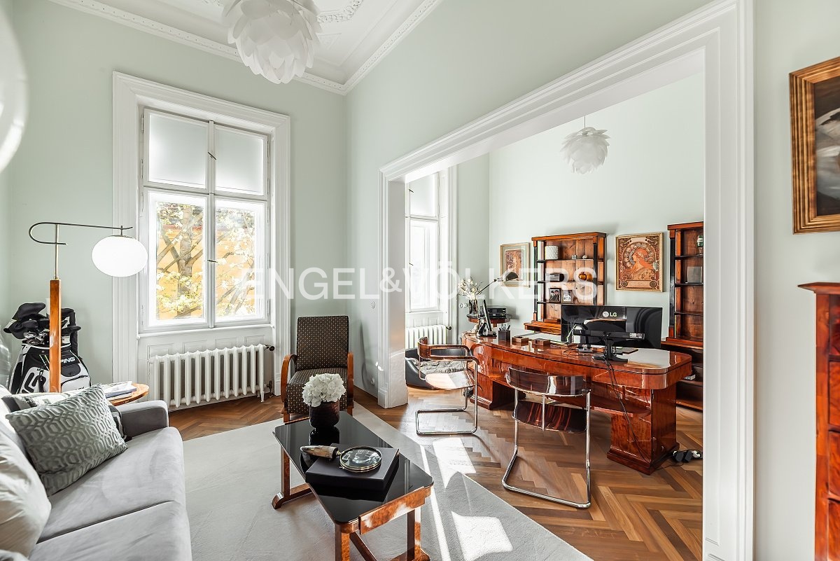 Interiér si zachoval původní historické prvky – zdobené a zlacené stropy, kachlová kamna a dvoukřídlé dveře. Byt dále nabízí parketové podlahy, stylová topná tělesa a keramické vypínače v historickém designu, vestavěné šatní skříně, repasovaná okna a vnitřní okenice. Vytápění zajišťuje vlastní plynový kotel.