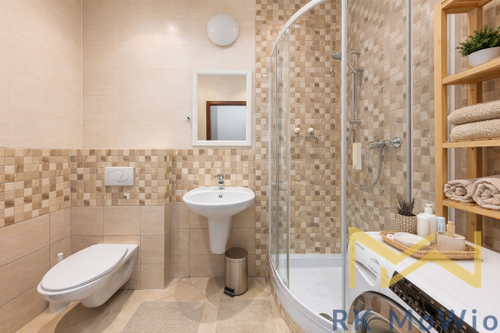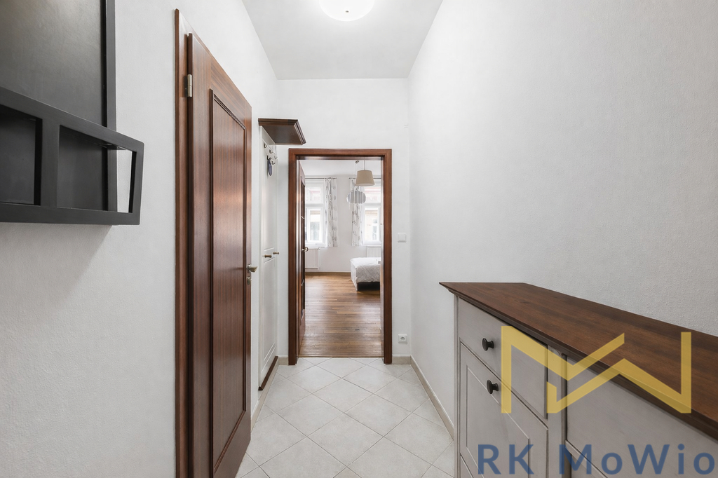 Půdorys bytové jednotky disponuje vstupní chodbou, obývacím prostorem s kuchyňským koutem a jídelní částí, ložnicovou částí a koupelnou (sprchový kout, umyvadlo, toaleta). Dispozice je řešena prakticky a nabízí efektivní využití prostoru pro pohodlné bydlení v centru města. Vybavení bytu zahrnuje kuchyňskou linku (včetně sklokeramické varné desky, elektrické trouby, digestoře a myčky), pračku, přípravu pro vysokorychlostní internet, dřevěné podlahy a dlažbu. Interiér působí světlým a vzdušným dojmem díky umístění bytu ve vyšším patře a dostatku denního světla.