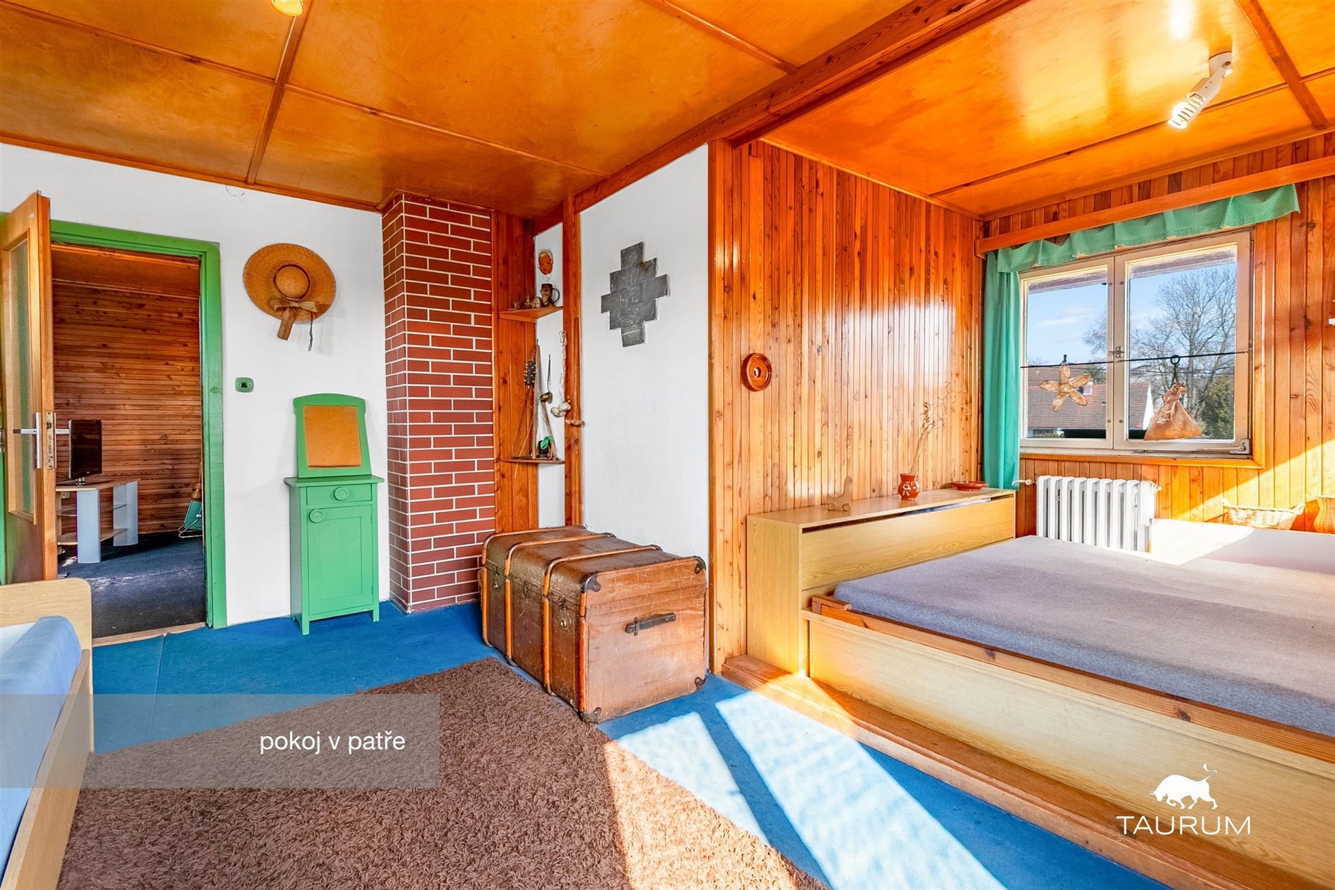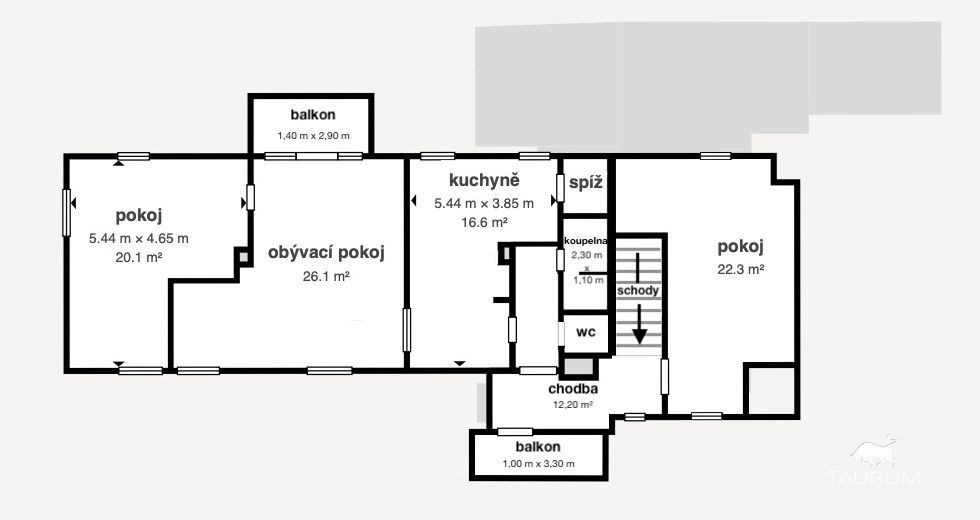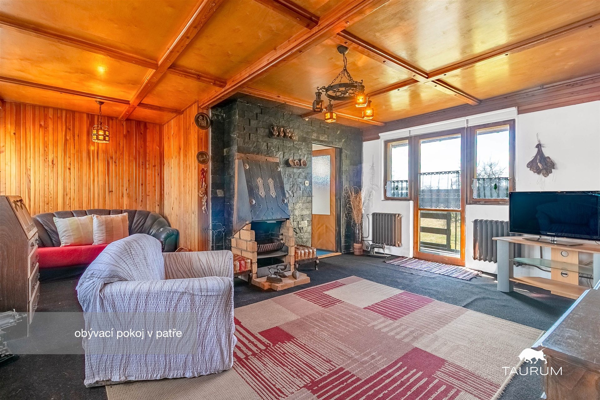 V patře jsou 3 obytné pokoje, kuchyň, koupelna spižírna a 2 balkony. V obývacím pokoji je umístěn krb.