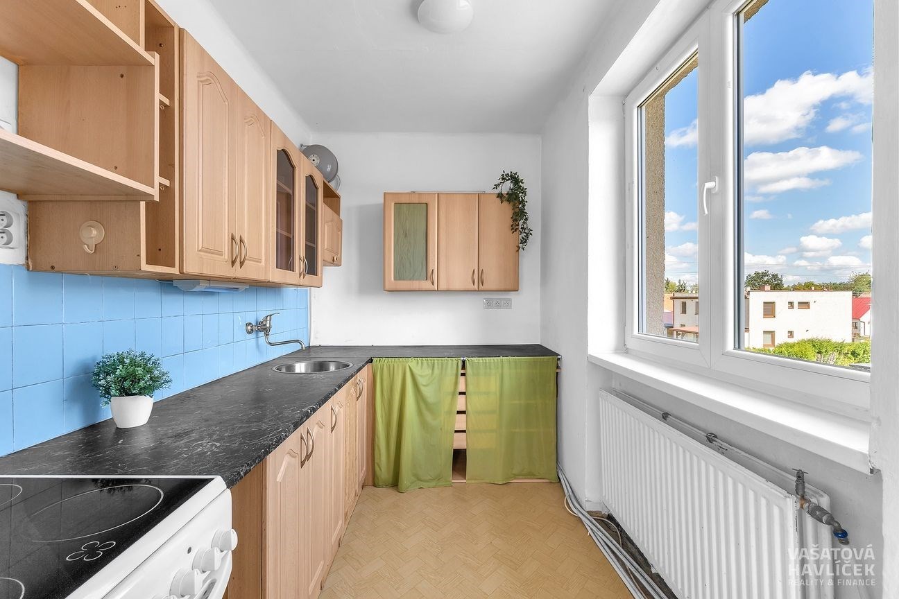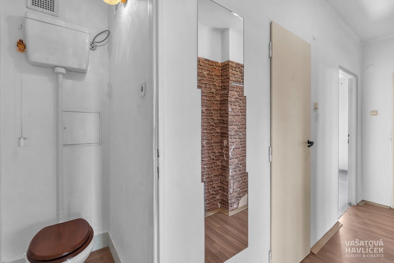 Byt je orientován na tři světové strany – kuchyň směřuje na východ, jídelna se spíží na jih a obývací pokoj s ložnicí na západ. Před pěti lety došlo k výměně původních dřevěných oken za plastová a k výměně vedení potrubí u radiátorů. Byt je v původním, ale zachovalém stavu a skýtá skvělou příležitost k rekonstrukci dle vlastních představ – s možností změny dispozice na 3+kk nebo 3+1. Dispozice: vstupní chodba, kuchyň s jídelnou, dva neprůchozí pokoje, spíž, komora, koupelna s vanou a samostatná toaleta. Na chodbě se nachází plovoucí podlaha a ve zbytku bytu linoleum.