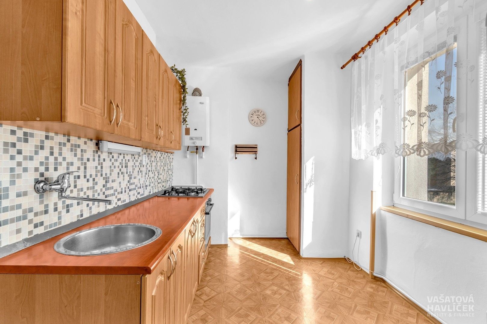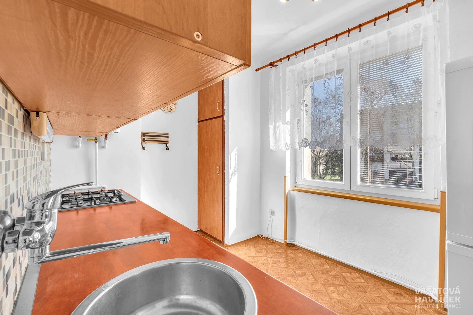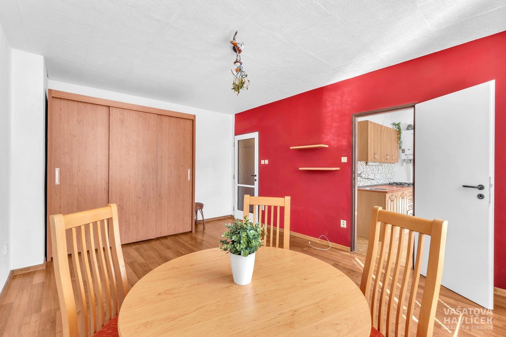 > kuchyňská linka s vestavnými spotřebiči (pečící trouba, plynová varná deska), jídelní stůl se židlemi