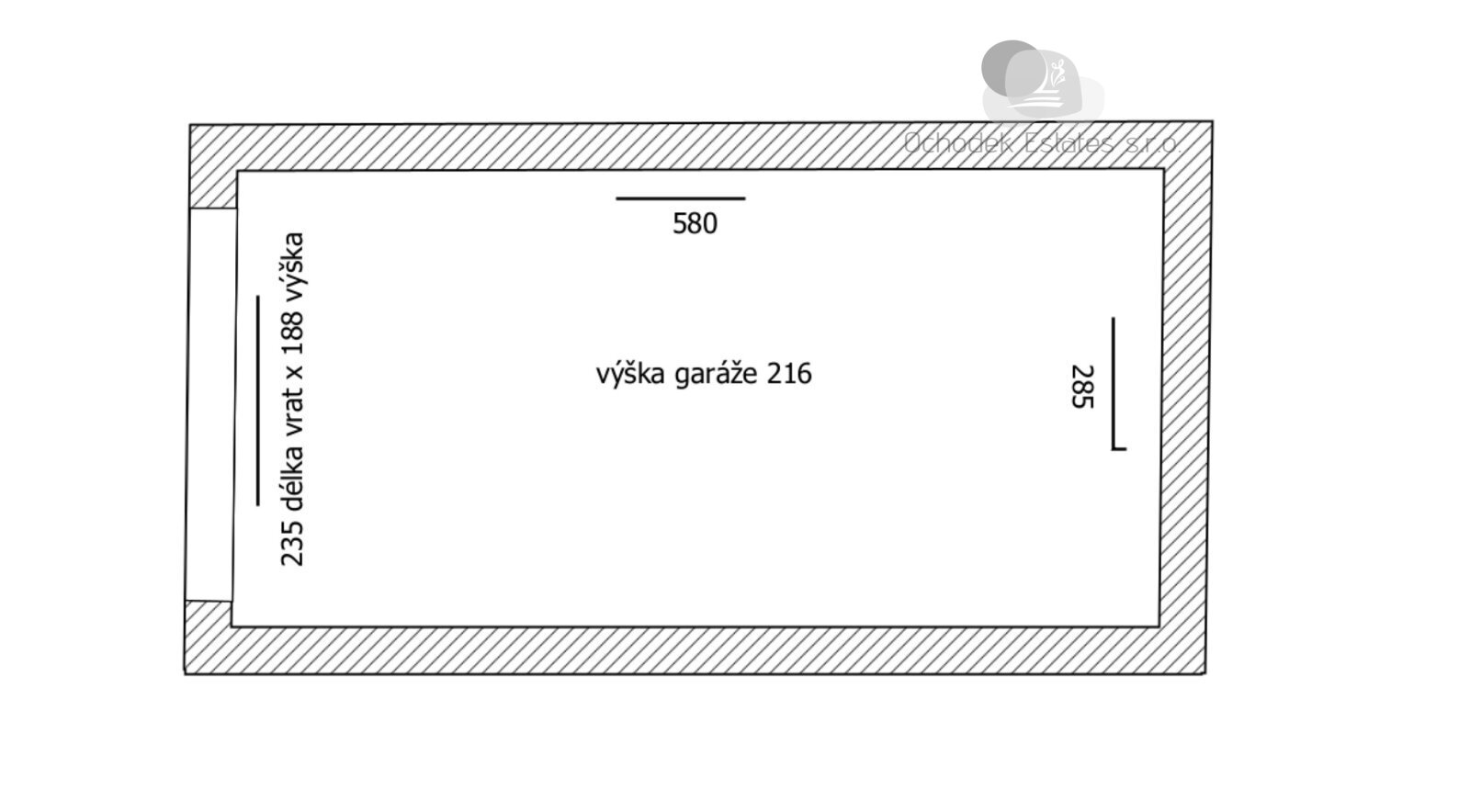 Samotná garáž má vnitřní délku 580cm, na šířku 285cm, výška 216cm. Vrata mají průjezdnou šířku 235cm a 188cm výšku.