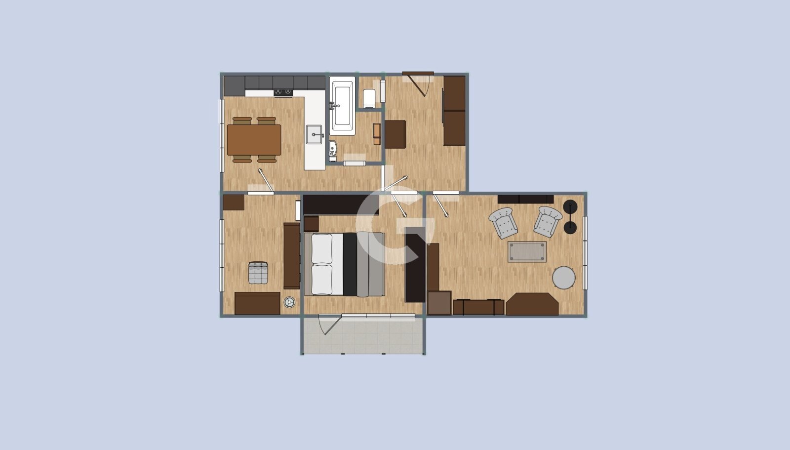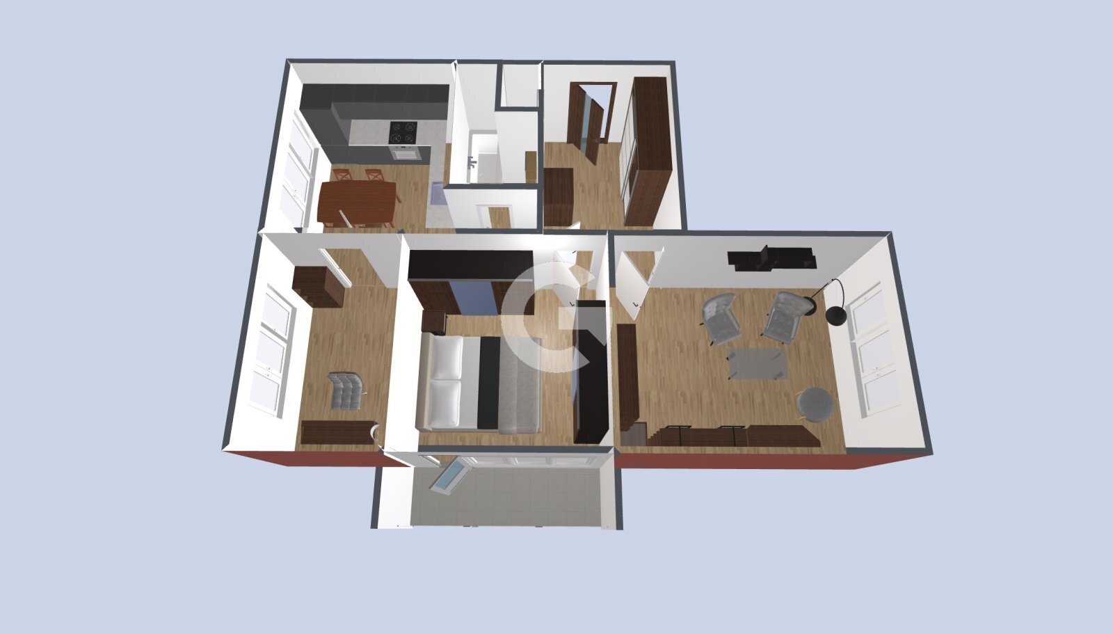 Z důvodu zachování soukromí majitelky nejsou zveřejněny fotografie interiéru. Uvedený půdorys však odpovídá skutečnému stavu bytu.