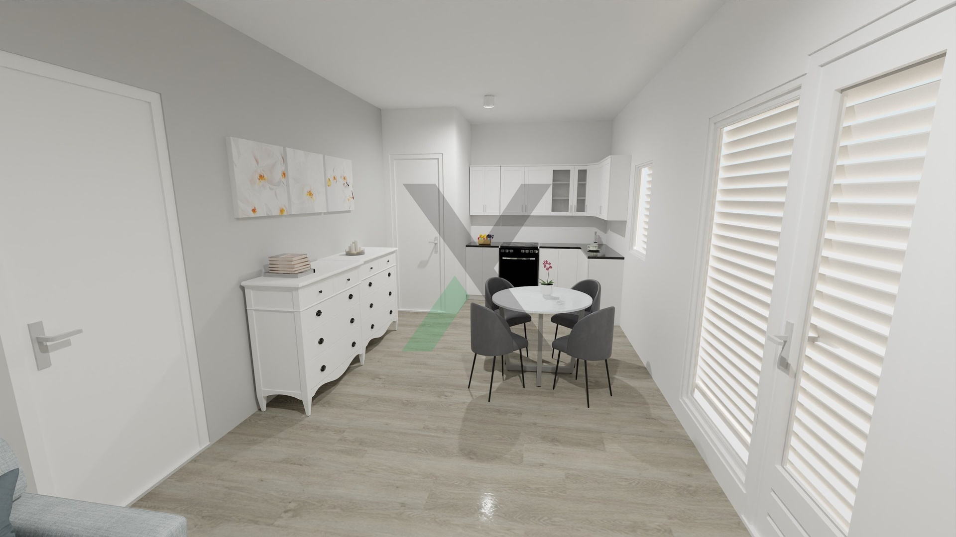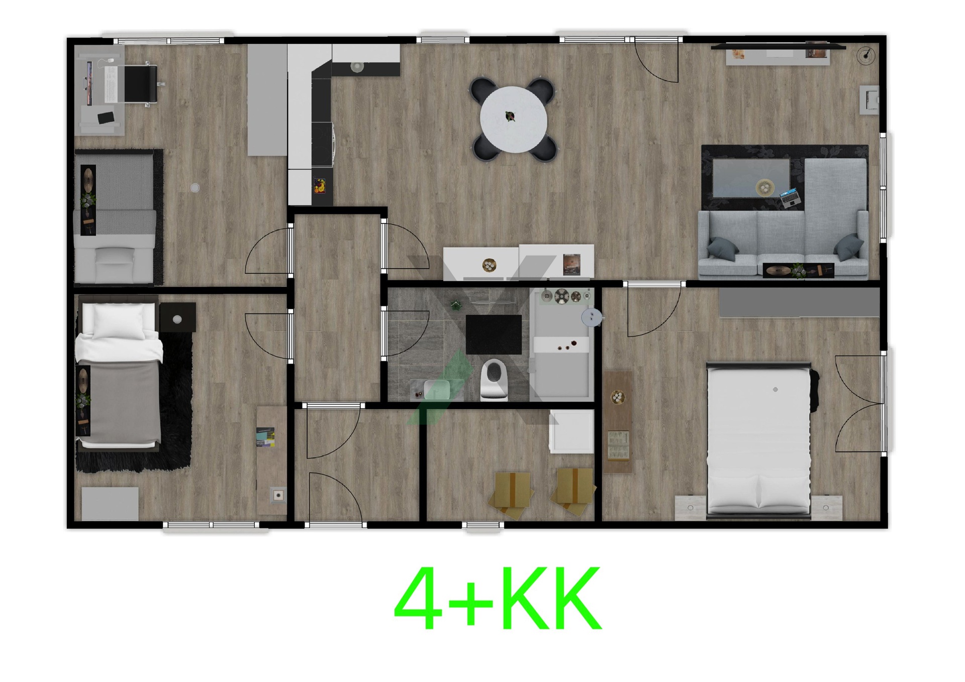 Přízemní bungalov lze užívat jako 4+KK (obývací pokoj s kuchyňským koutem, ložnice a dva dětské pokoje) nebo jako 3+1 (samostatný obývací pokoj, kuchyně a dvě ložnice).