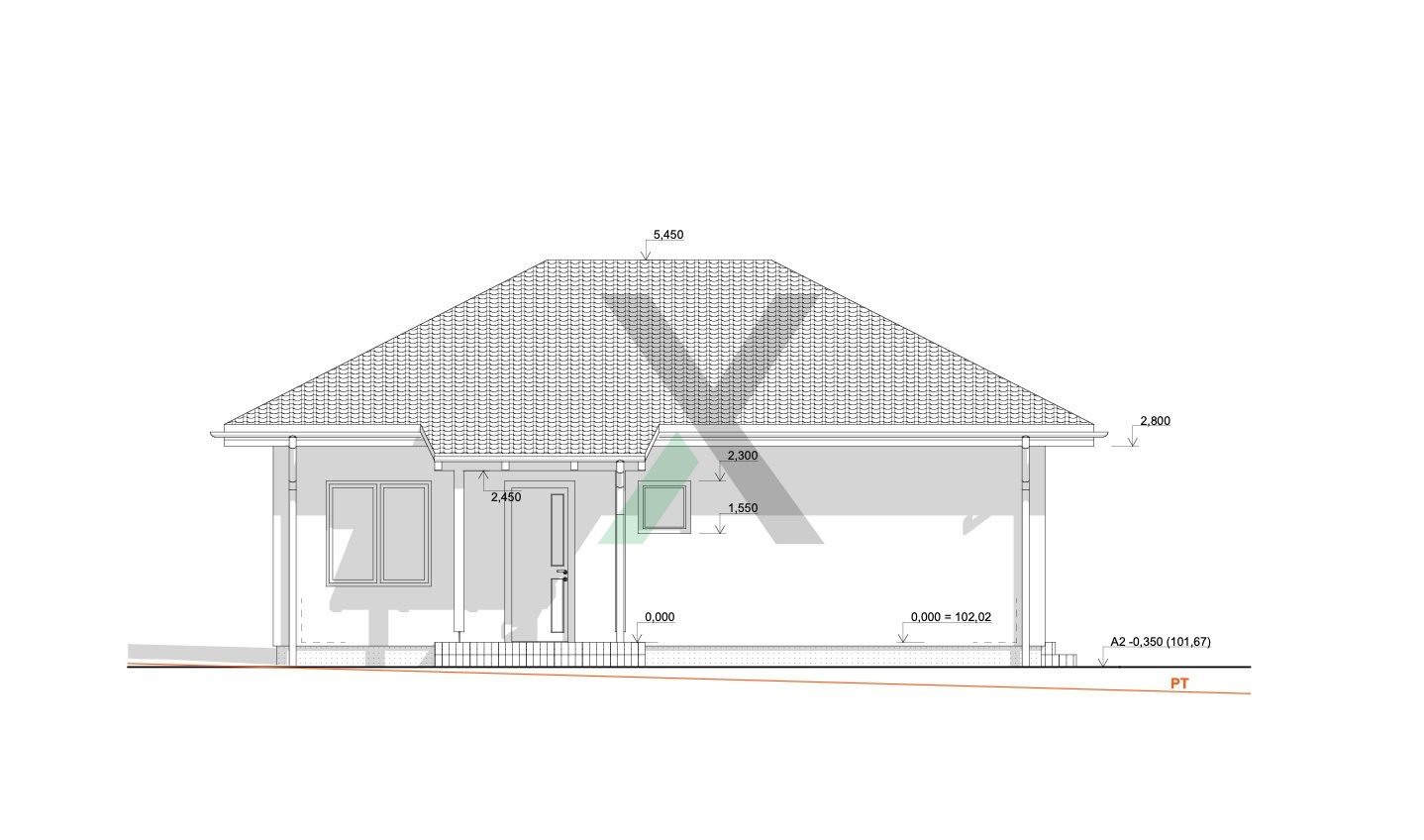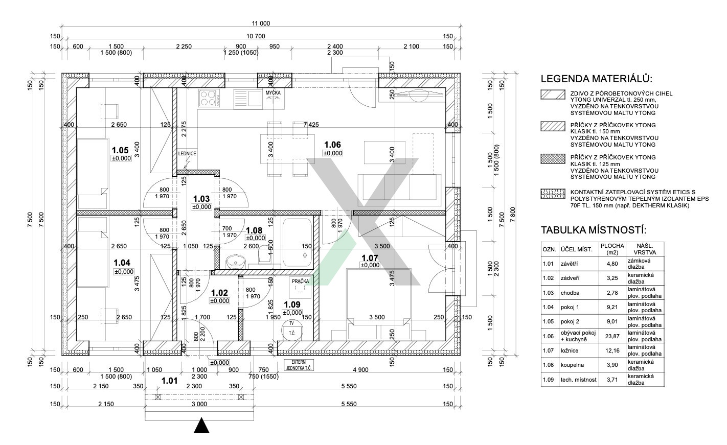 Přízemní bungalov na základech 11 m x 7,8 m je z pórobetonových tvárnic, střecha z pálené tašky. Okna jsou sedmi komorová Rehau Synego. Vytápění domu zajišťuje tepelné čerpadlo značky De Dietrich, o ohřev vody se stará elektrický kotel. Orientace střechy je na jih a je připravena nabídka na fotovoltaickou elektrárnu, která počítá s bateriovým uložištěm a nabíjecí stanicí pro elektromobil (WallBox).