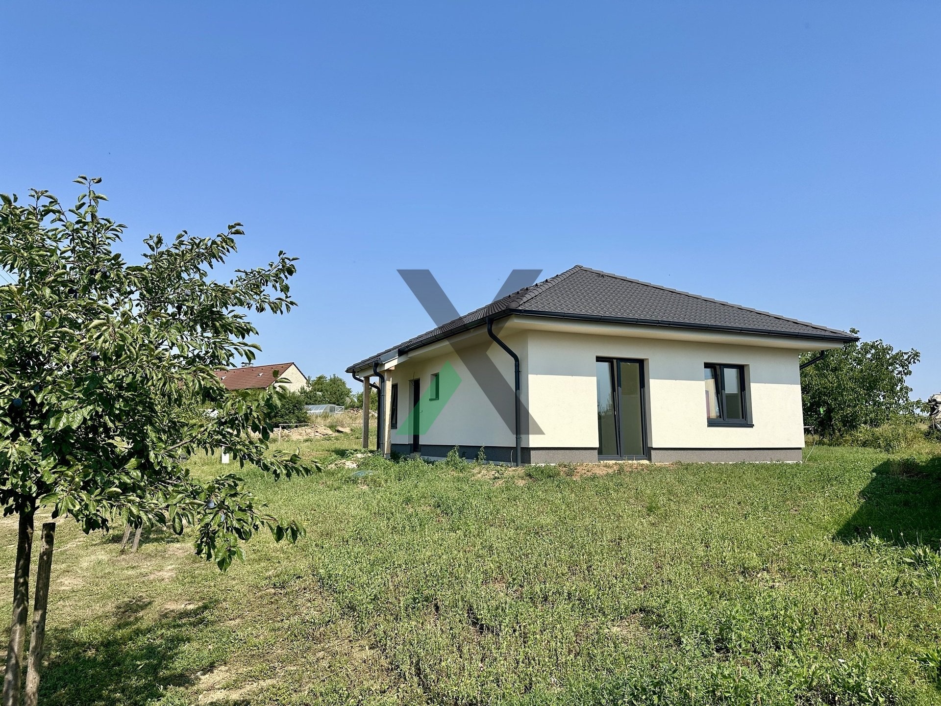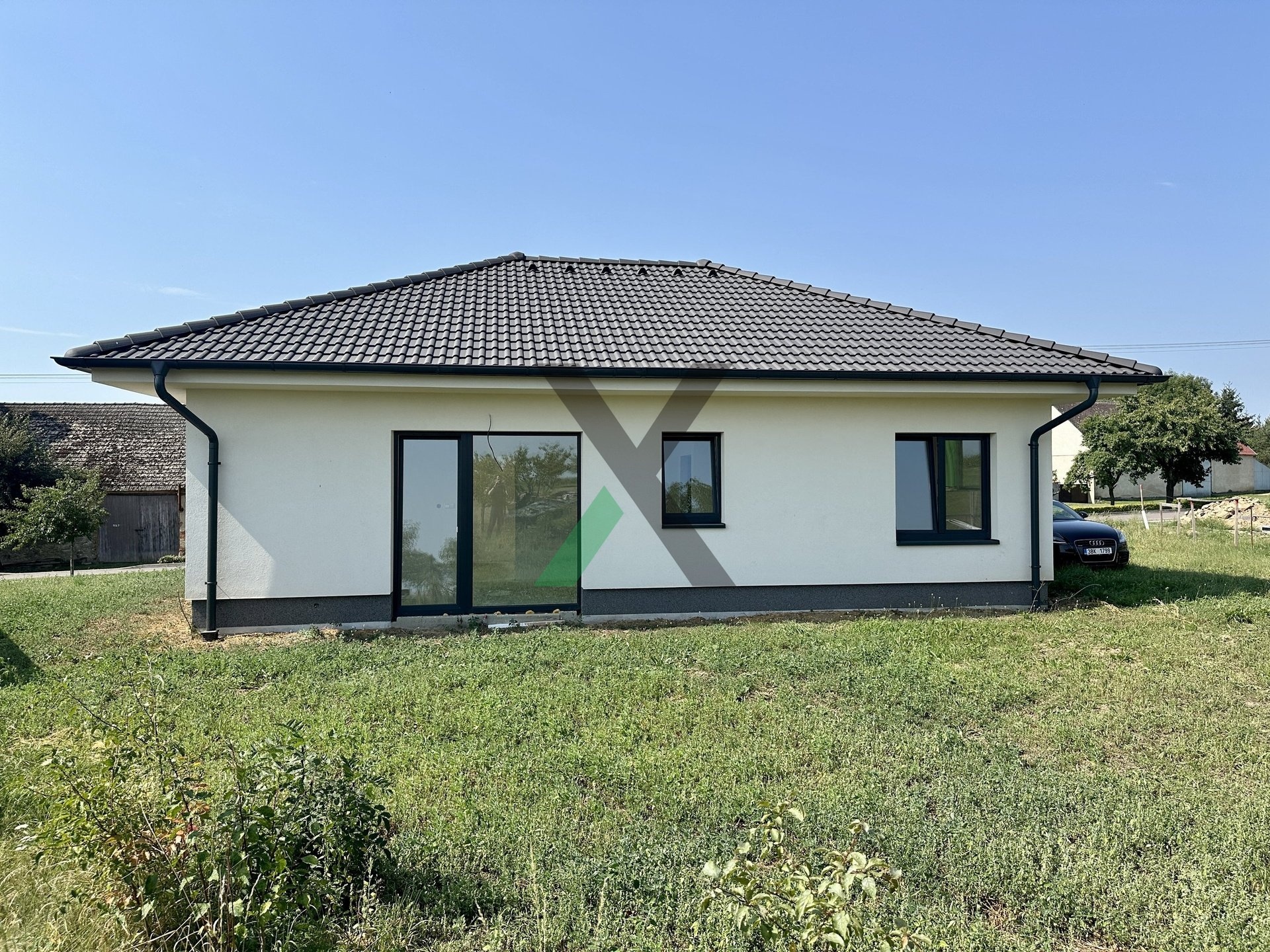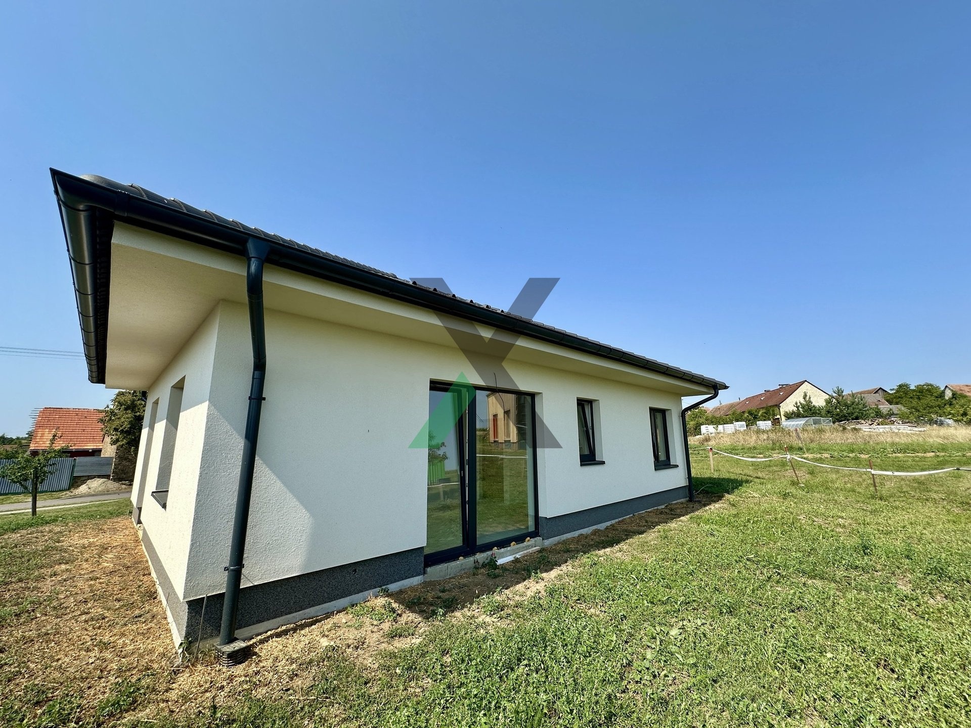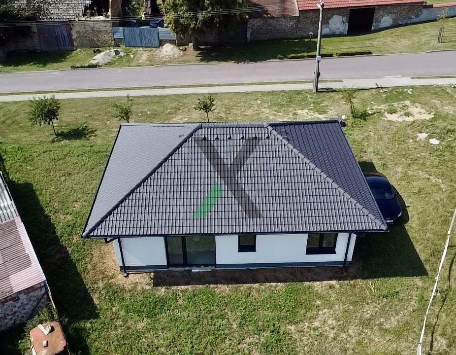 Přízemní bungalov o zastavěné ploše 90 m² stojí na trojúhelníkovém pozemku o výměře 494 m² a nabízí ideální kombinaci moderního bydlení a venkovského klidu.
