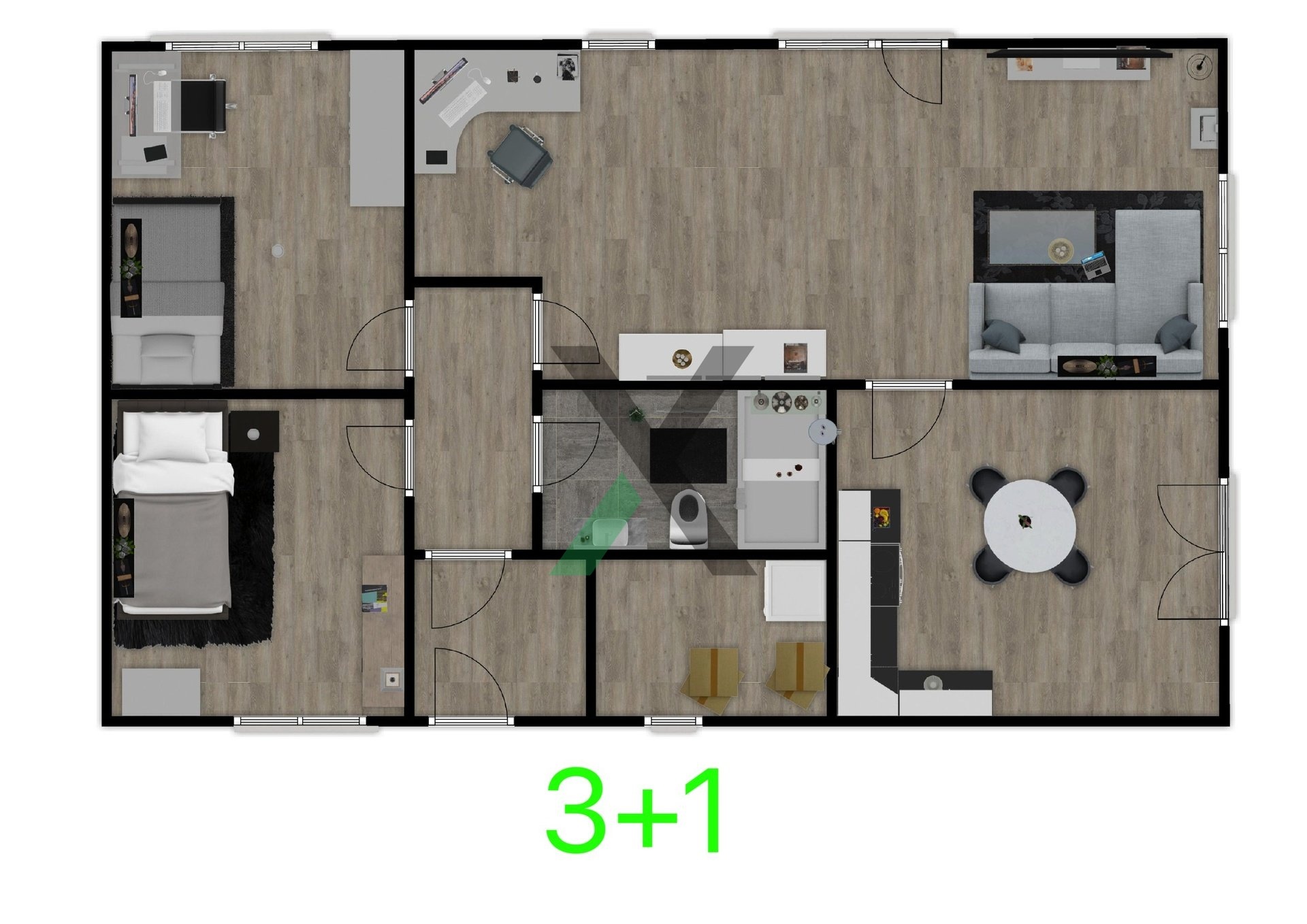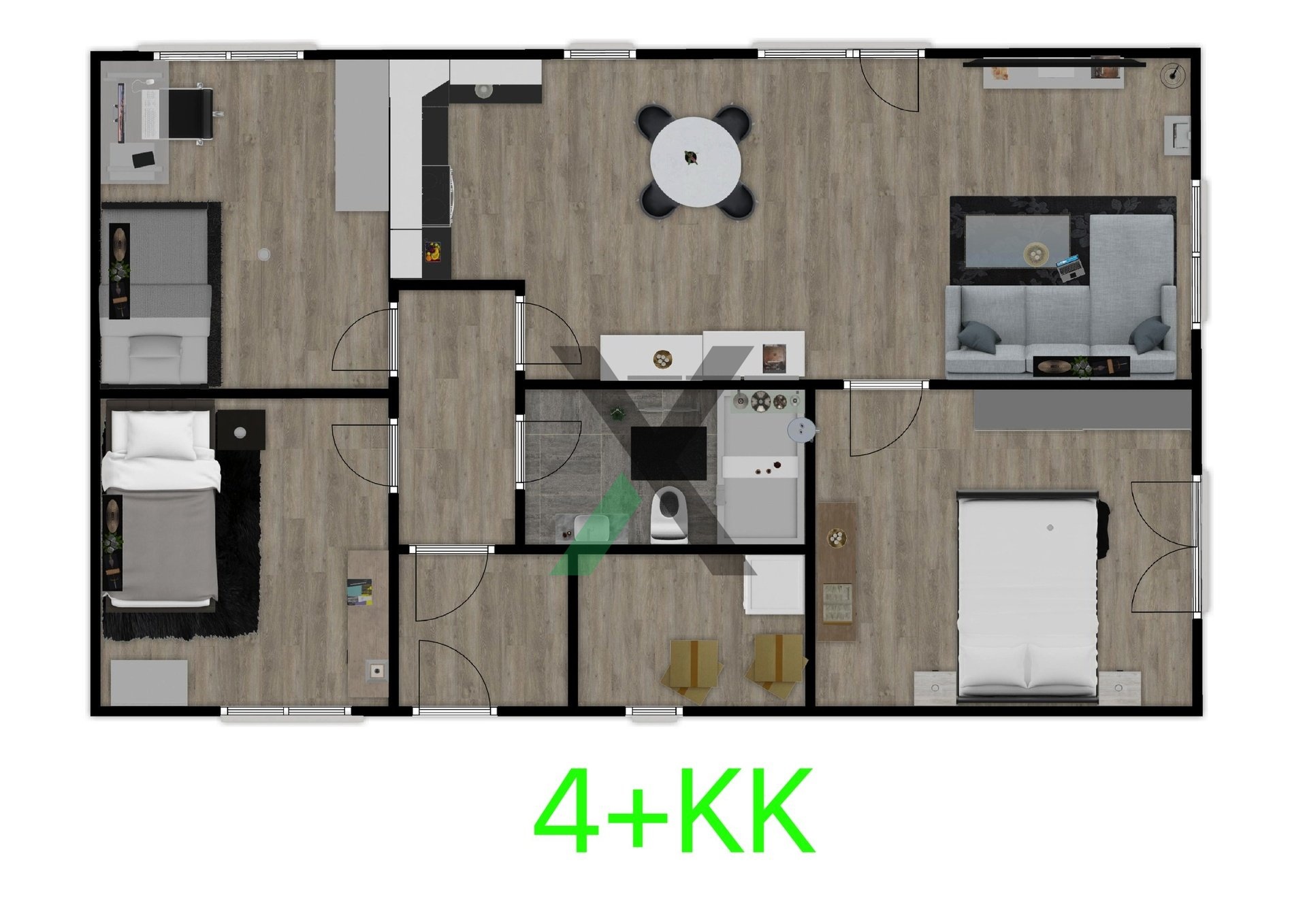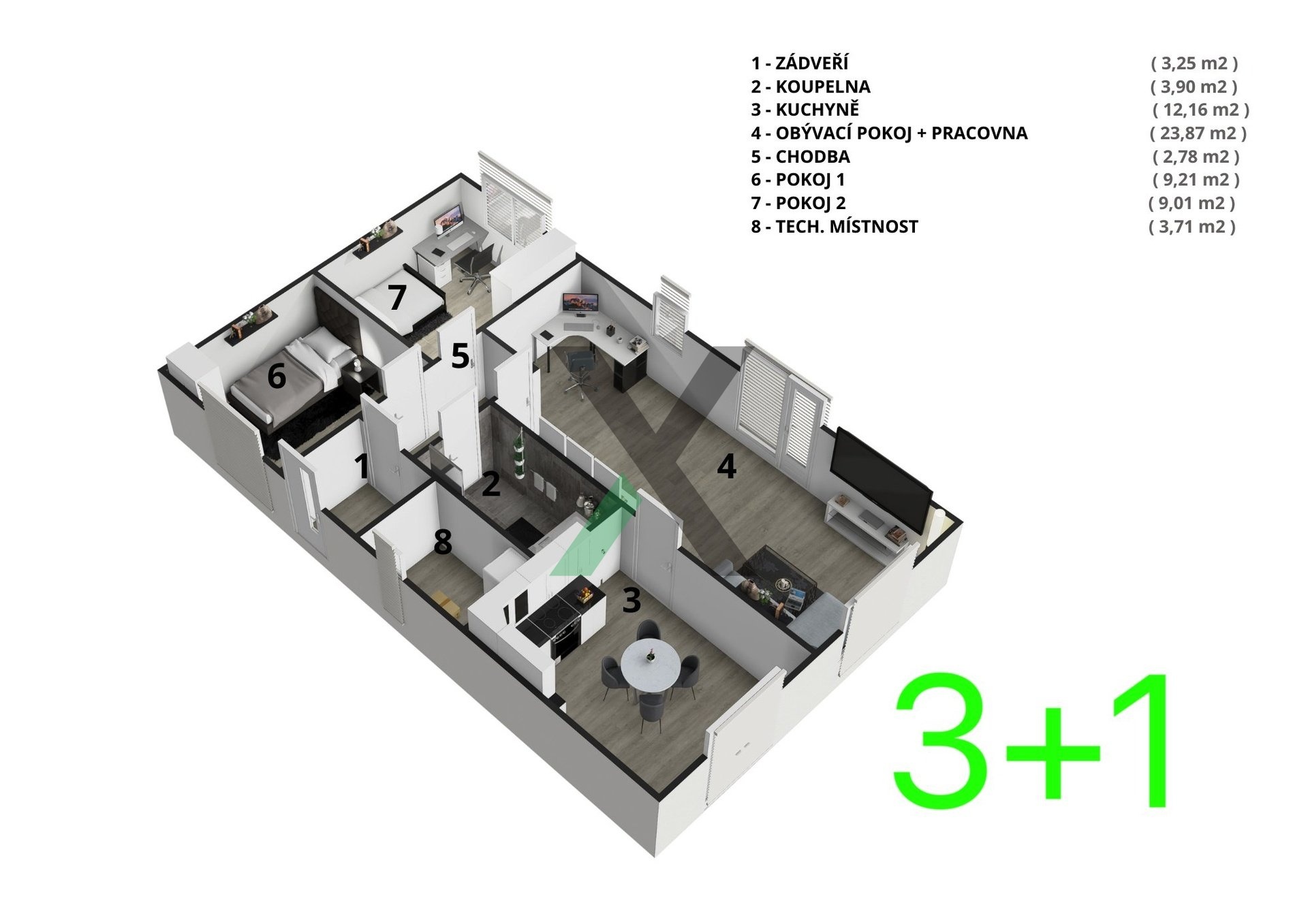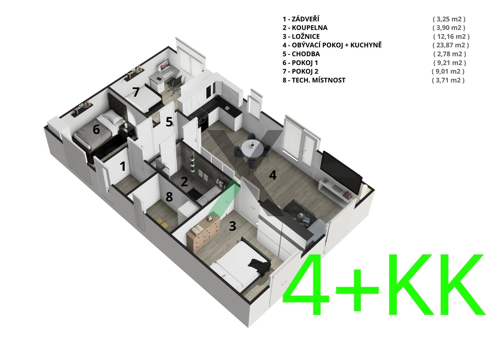 Najdete zde prostorný obývací pokoj s kuchyňským koutem (24 m²), ložnici (12 m²), dva pokoje po 9 m², koupelnu (4 m²) a technickou místnost (4 m²) s místem pro pračku a sušičku.