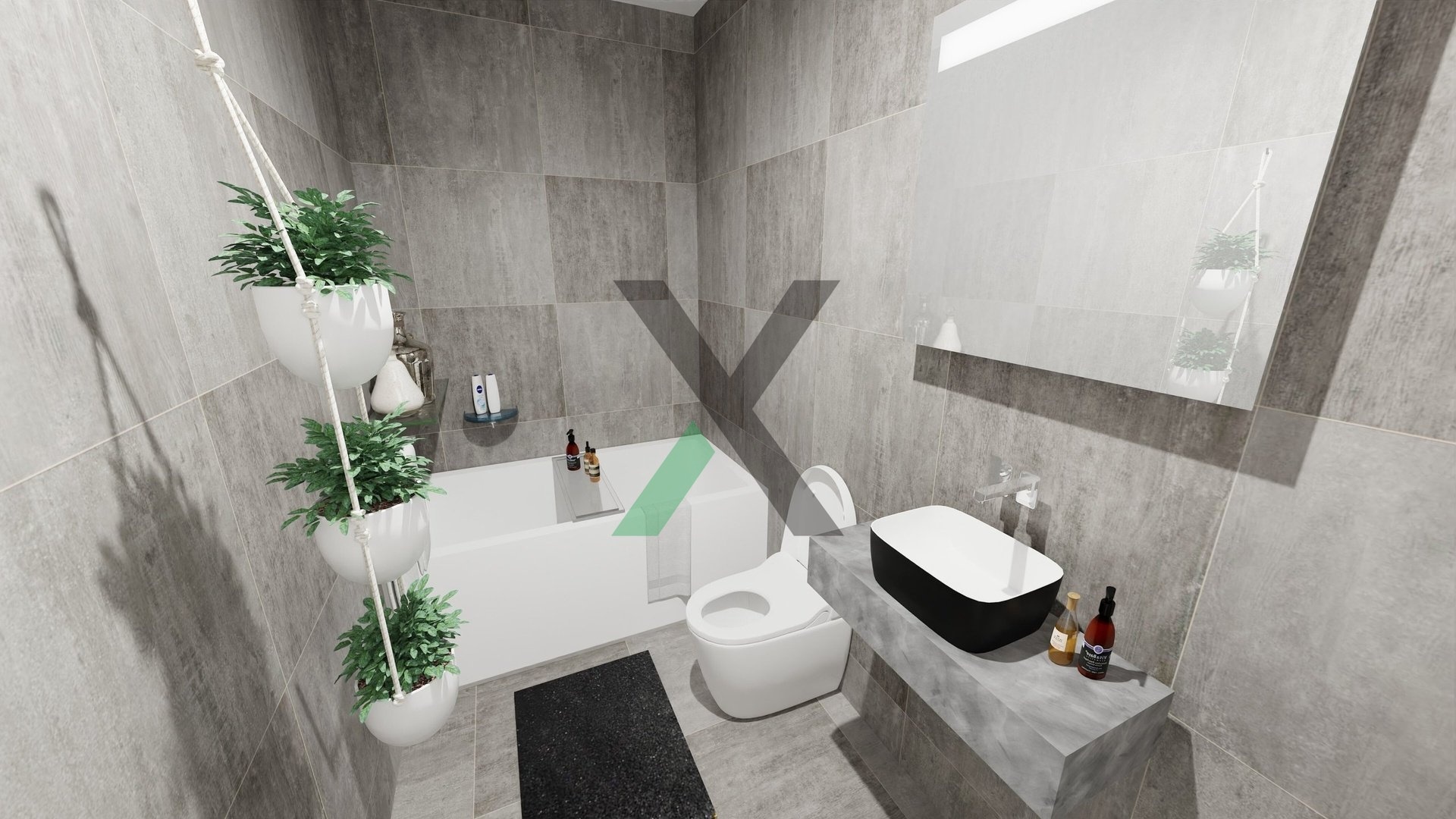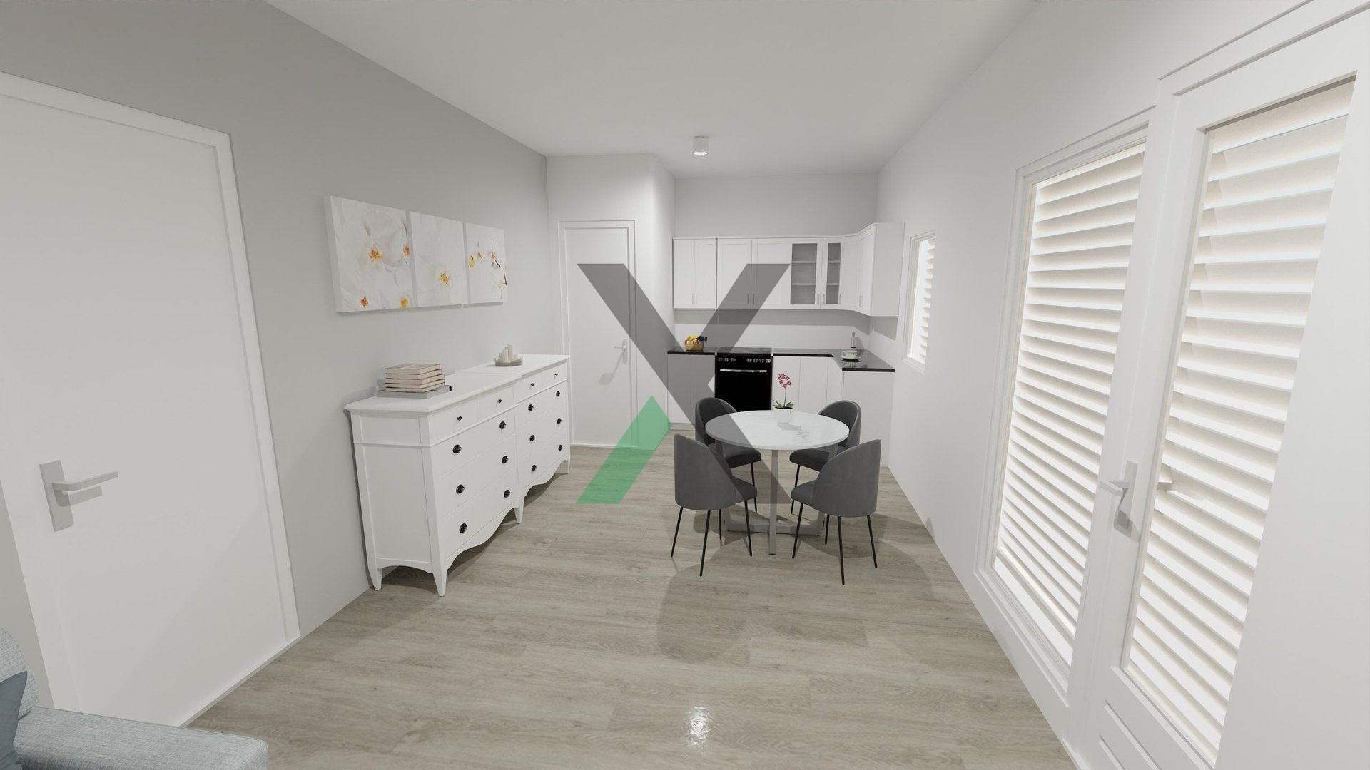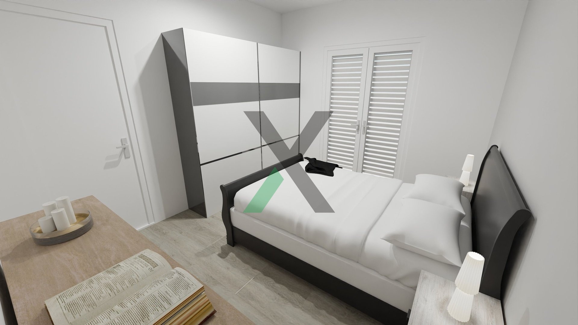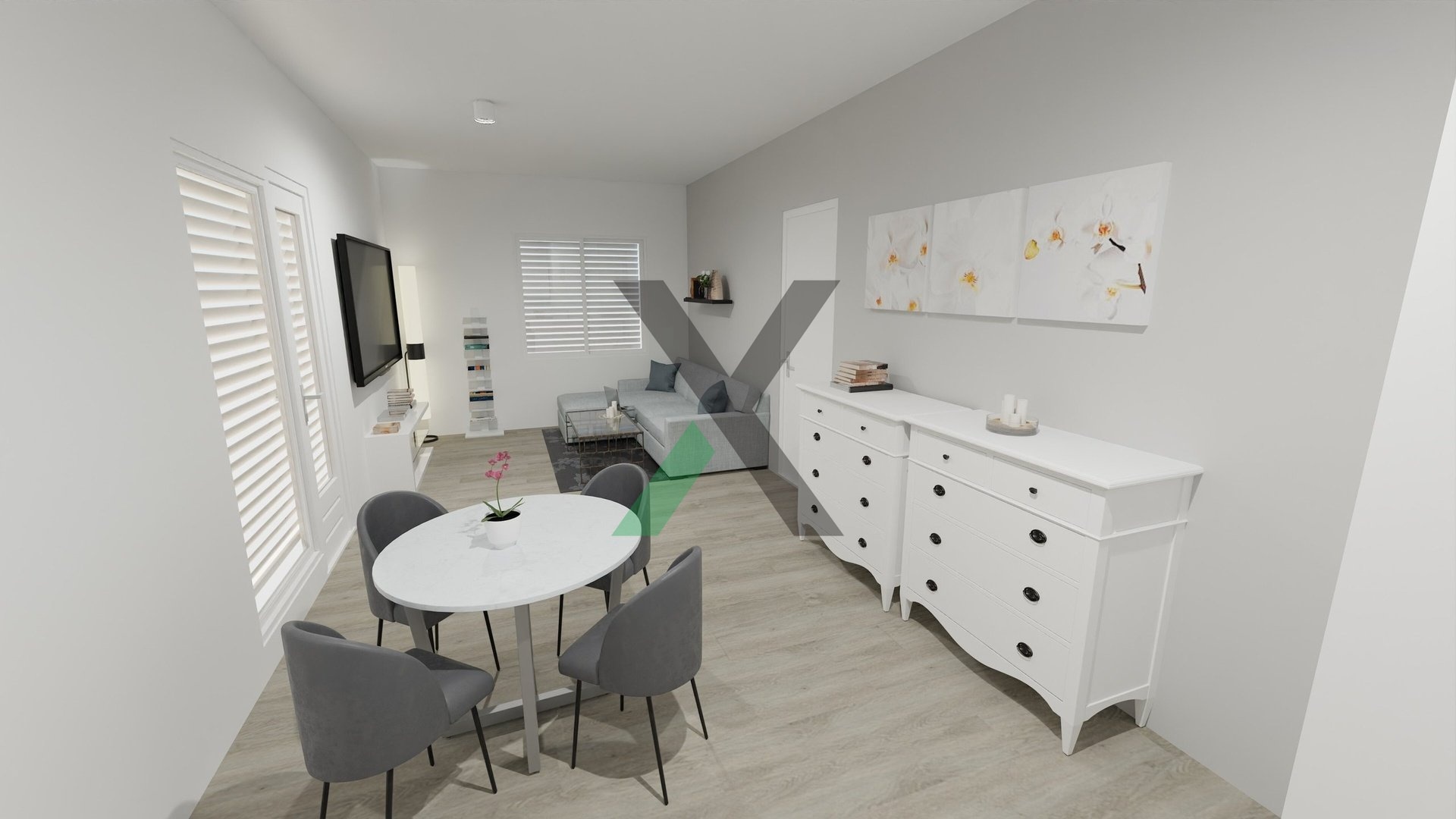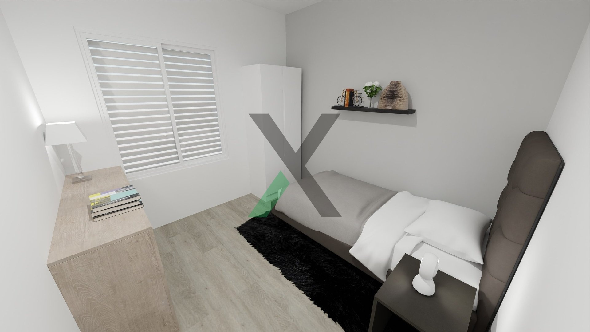 Najdete zde prostorný obývací pokoj s kuchyňským koutem (24 m²), ložnici (12 m²), dva pokoje po 9 m², koupelnu (4 m²) a technickou místnost (4 m²) s místem pro pračku a sušičku.