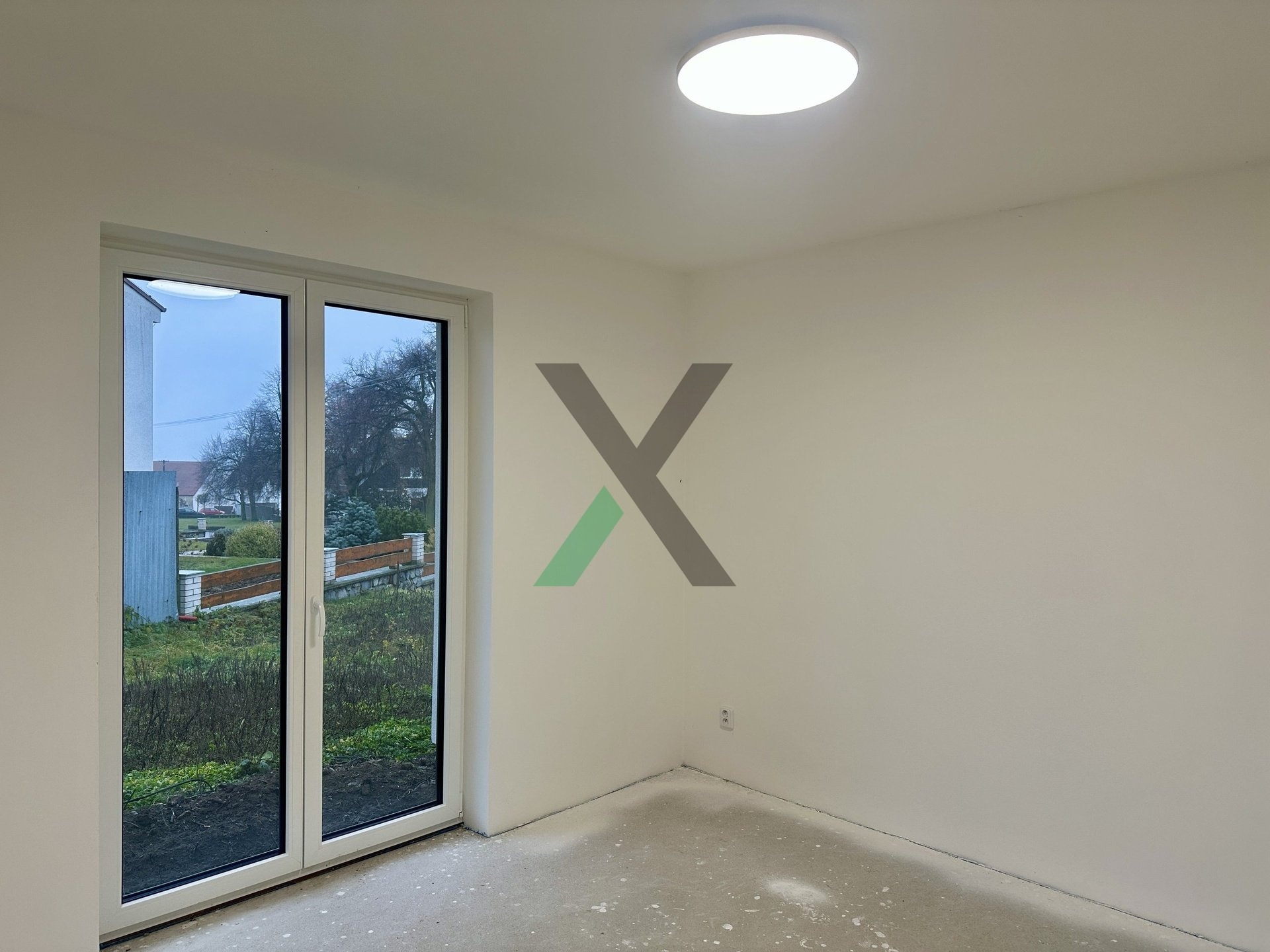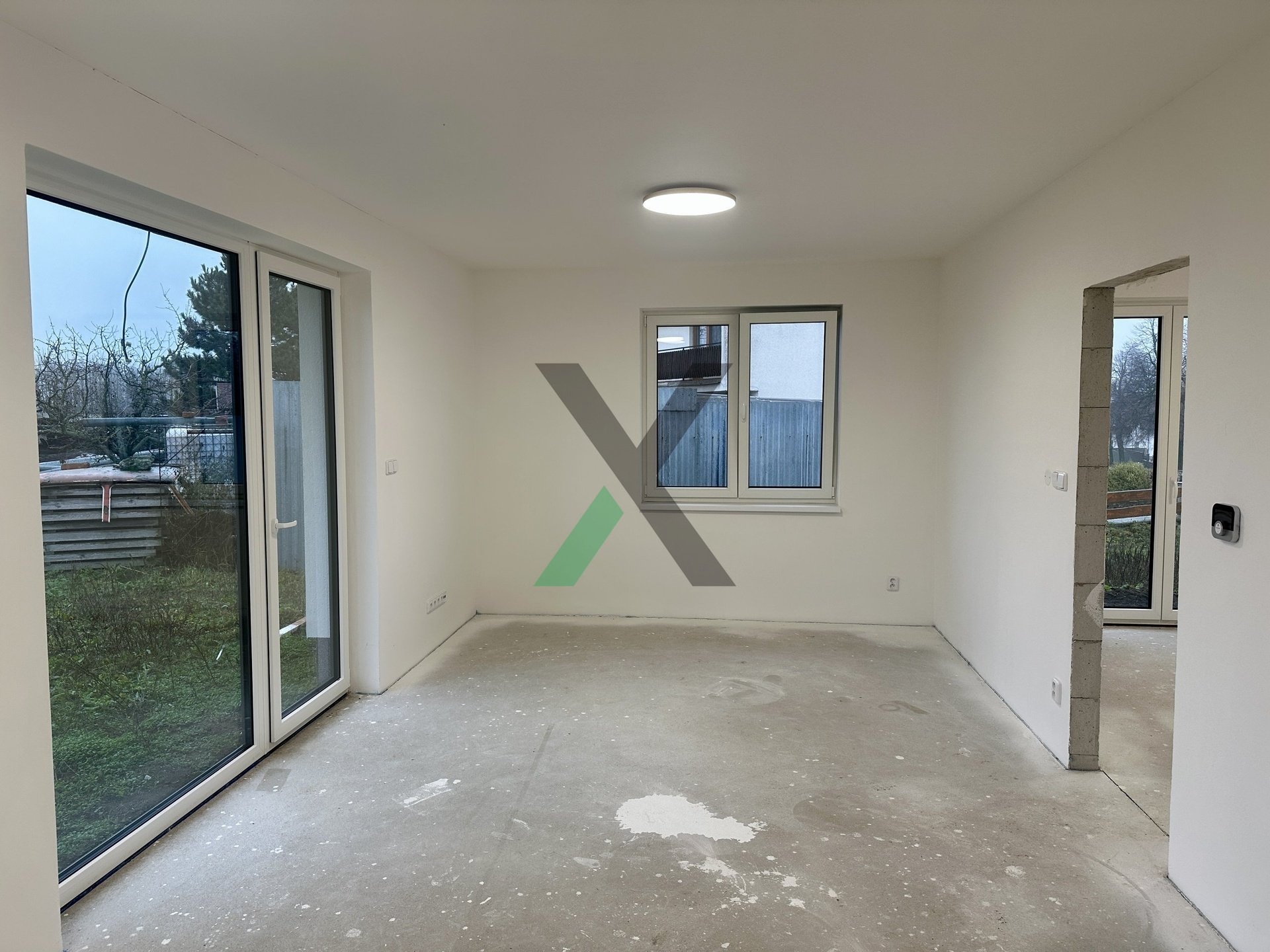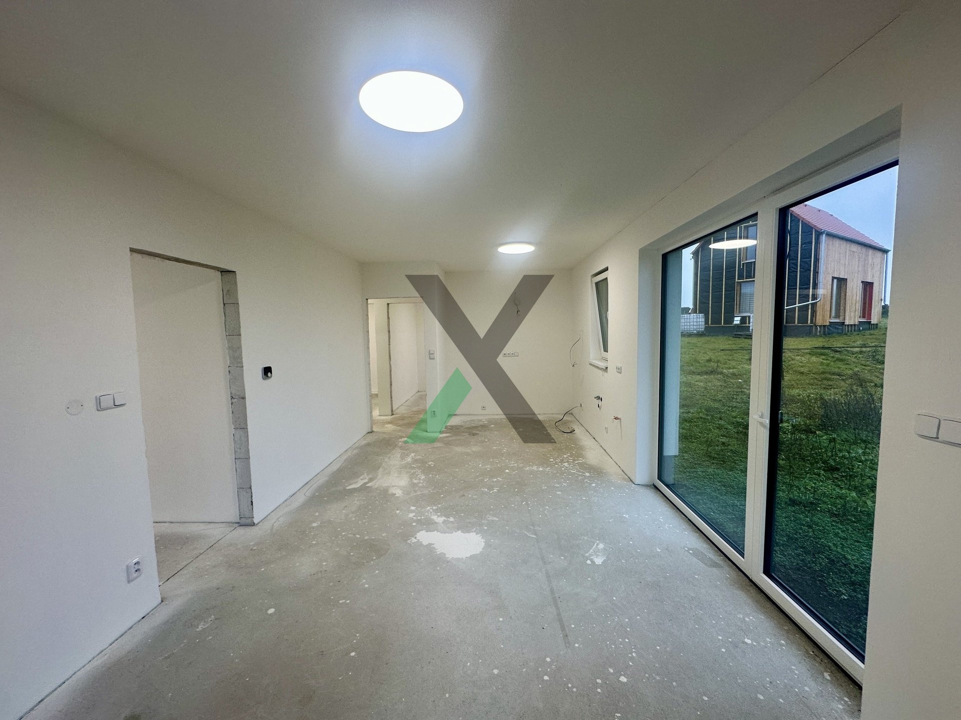 Interiér i exteriér čeká na dokončení podle vašeho vkusu – podlahy, kuchyň, dveře, koupelna i terasa.