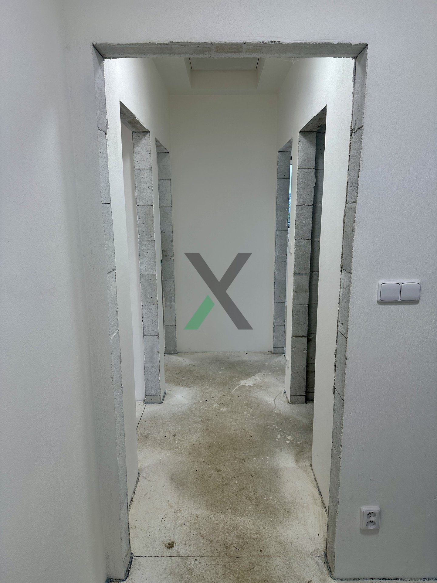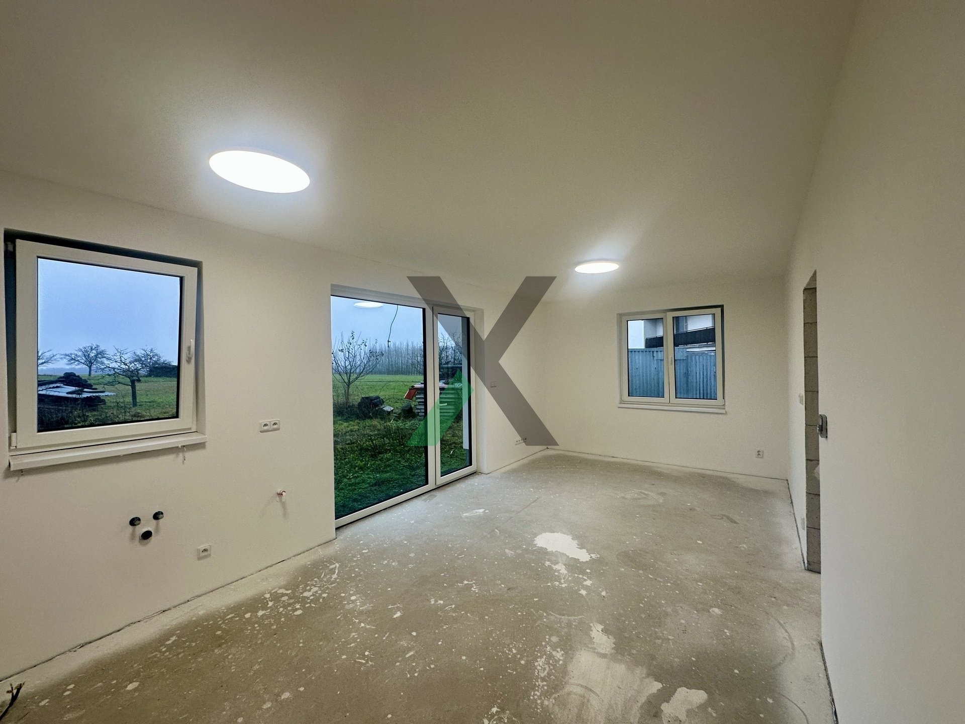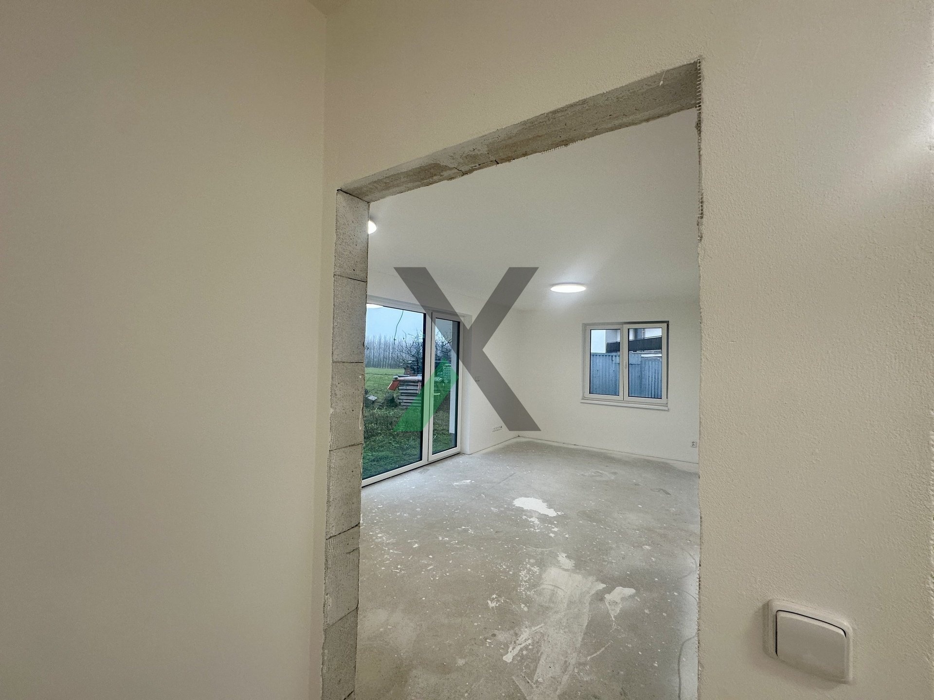 Interiér i exteriér čeká na dokončení podle vašeho vkusu – podlahy, kuchyň, dveře, koupelna i terasa.