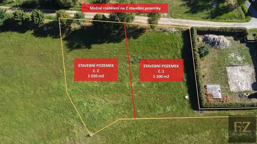 Nabízí se i možnost rozdělení pozemku na dvě samostatné parcely. Po dohodě je majitel ochoten i rozdělení zajistit a odprodat pouze požadovanou část.
