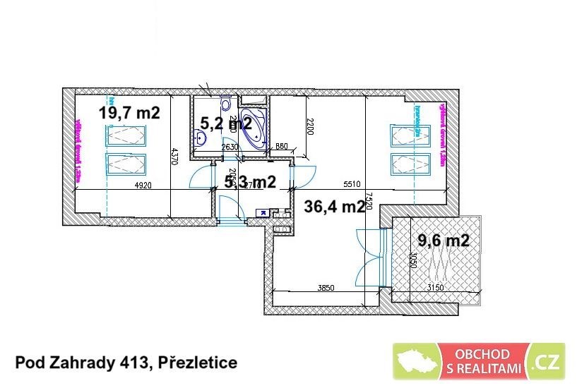 Bytová jednotka 2+KK (o výměře 66 m2 + terasa 10 m2 + sklep 2) se nachází na adrese Pod Zahrady 413, Přezletice. K bytu náleží vyhrazené parkovací stání před domem!