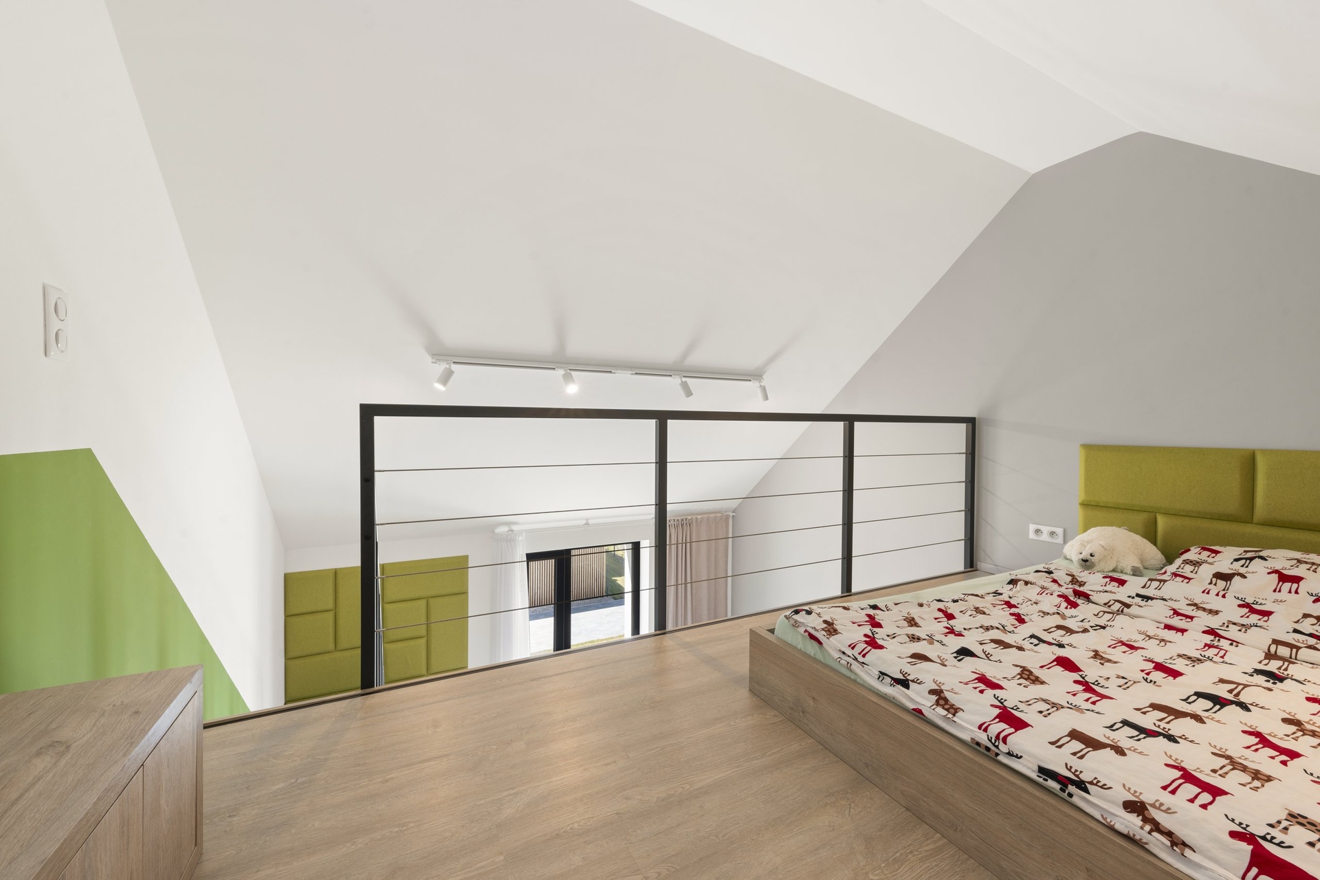 V patře najdete tři ložnice – hlavní ložnice má vlastní koupelnu se sprchovým koutem a toaletou a prostornou šatnu, dva dětské pokoje jsou vybaveny chytrými vestavnými patry, která šetří místo a přinášejí další hrací i úložný prostor. K dispozici je zde také druhá koupelna s vanou a samostatné WC.