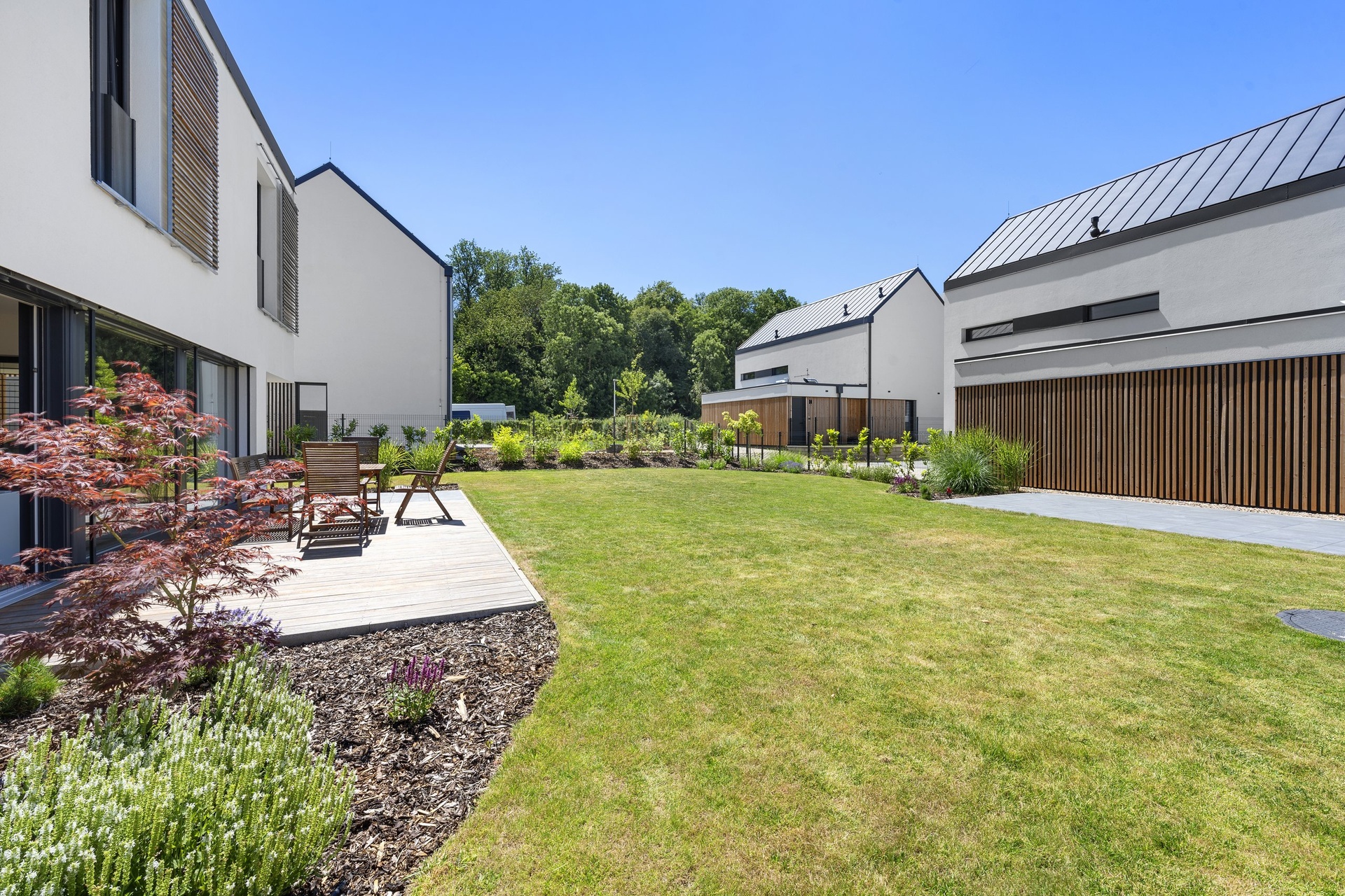 Zahrada je pečlivě upravená, s okrasnými záhony a automatickým zavlažovacím systémem napojeným na nádrž na dešťovou vodu. Terasa navazující na obývací pokoj nabízí příjemný prostor pro relaxaci a posezení. K domu náleží prostorná garáž a zpevněný příjezdový prostor pro další parkování.