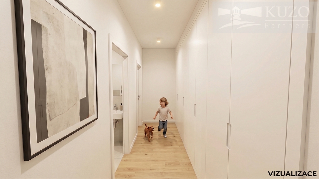 Kreativní dispozice: Nabízí se zde velmi oblíbená úprava – zvětšení koupelny na úkor zbytečně velkorysé chodby, čímž získáte moderní a vzdušné zázemí.