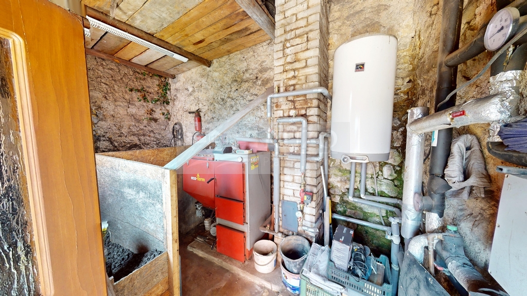 Přízemí: Praktické uspořádání zahrnuje sklad, šatnu a technickou místnost s elektrickým bojlerem. Z vnější strany domu je přístupná kotelna s kotlem na tuhá paliva (uhlí) a elektrokotlem, doplněná bojlerem pro kotel.