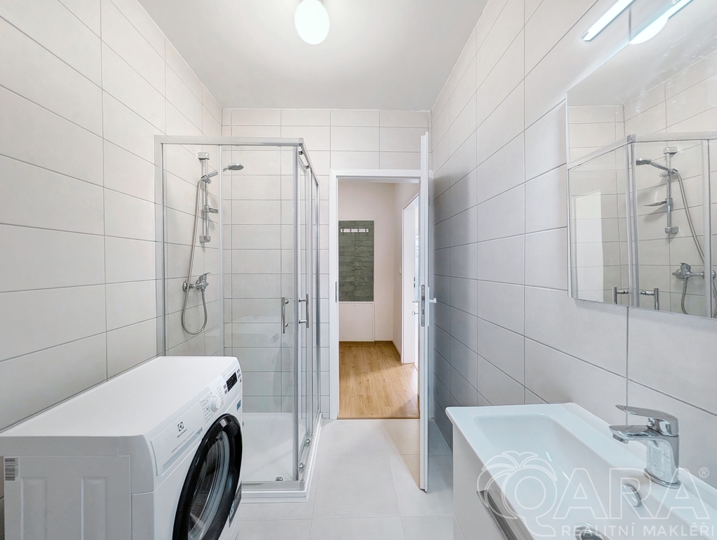 Byt je částečně vybavený – k dispozici je kuchyňská linka (sklokeramická deska), lednice, pračka, gauč, jídelní stůl a dvě židle. Velkou výhodou je podlahové vytápění v celém bytě, které zajišťuje vysoký komfort bydlení a zároveň velmi nízké náklady na provoz.