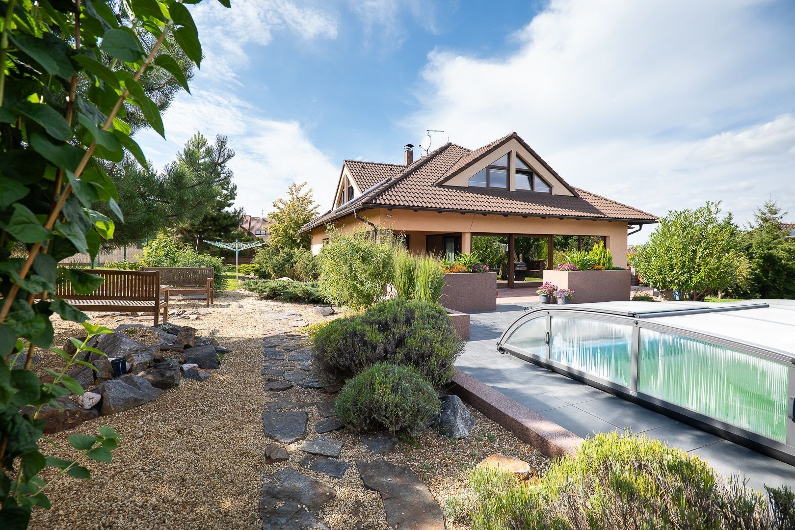 Okrasná zahrada s upravenou zelení a zahradním domkem nabízí dostatek prostoru pro relax i rodinná setkání. Večer si můžete užít posezení u ohně, přes den zase slunnou terasu nebo bazén.