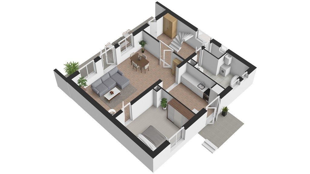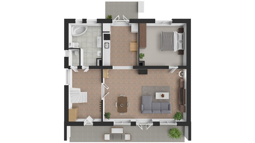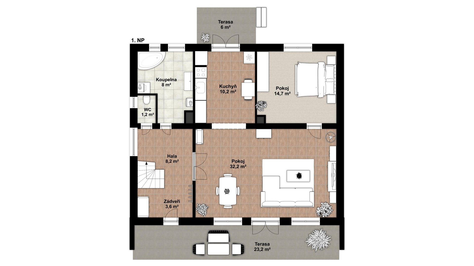 1. NP - terasa 23 m2, vstupní hala se schodištěm 12 m2, kuchyně s prostupem do zahrady a orientací severním směrem 10 m2, obývací pokoj (jih) s krbem a prostupem na venkovní terasu 32 m2, ložnice (sever) 15 m2 a koupelna 8 m2, WC samostatné.