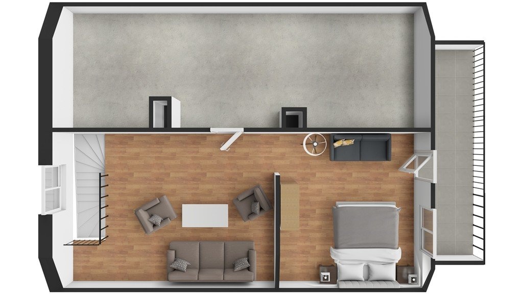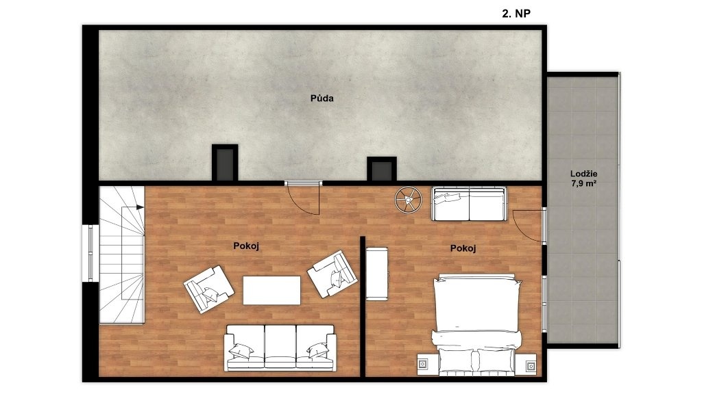 2. NP/podkroví - 2 x průchozí pokoj s výměrou 18 a 14 m2 a orientací východ (s lodžií 8 m2) a západ, půdní prostor ve střešní šikmině 25 m2 (všechny výměry jsou zaokrouhleny).